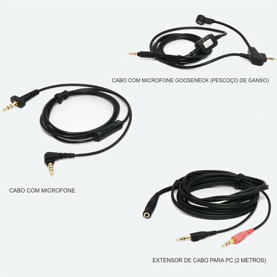 Este cabo pode ser desconectado e substituído pelo cabo do smartphone incluso, que possui microfone e controlador no corpo do cabo ou pode ser substituido pelo cabo de extensão com dois miniconexões de 3,5 mm para microfone e áudio separados para usar em seu PC.