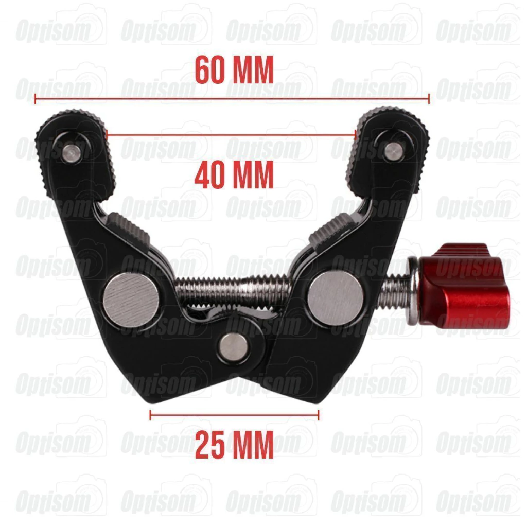Garra Mini Clamp braçadeira para tubos e superfícies retas Greika com rosca 3/8" e rosca 1/4" para fixar acessórios.