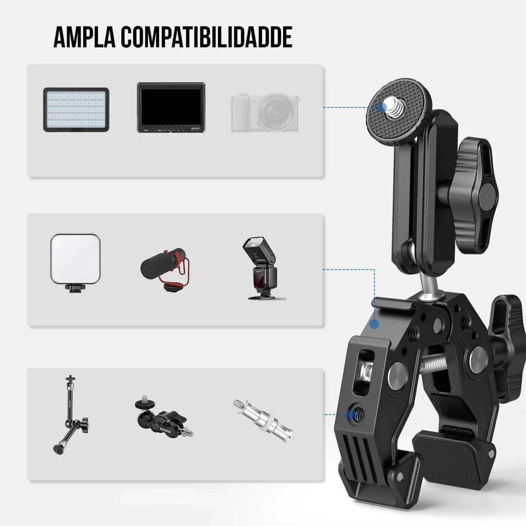 A super braçadeira segura firmemente objetos com um diâmetro de 14-60 mm, perfeita para superfícies planas como mesas e tripés, objetos cilíndricos como bastões de selfie, suportes de luz, plataformas de ombro e guidões de bicicleta e motocicletaemuito mais, e também compatível com hastes estabilizadoras de gimbal DJI Ronin-M Ronin MX e Freefly Movi de 25 mm e 30 mm.