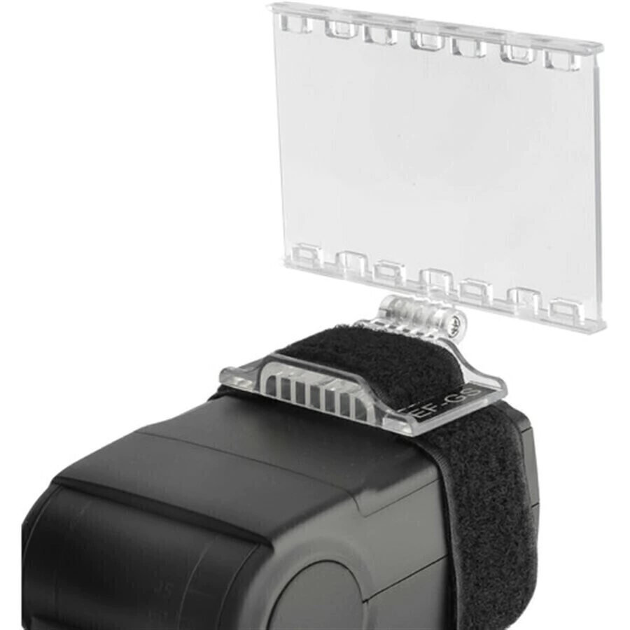 Compatível com a maioria dos flashes disponíveis no mercado, este suporte de gel utiliza uma alça com prendedores de gancho e fita velcro para prender com segurança à cabeça do flash e, em seguida, oferecerá aos usuários um slot conveniente para deslizar em um dos trinta géis inclusos