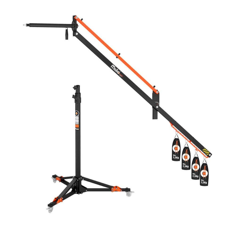 Girafa completa, com haste e tripé, para suporte de iluminação em estúdio fotográfico ou broadcast, podendo usar câmeras também.