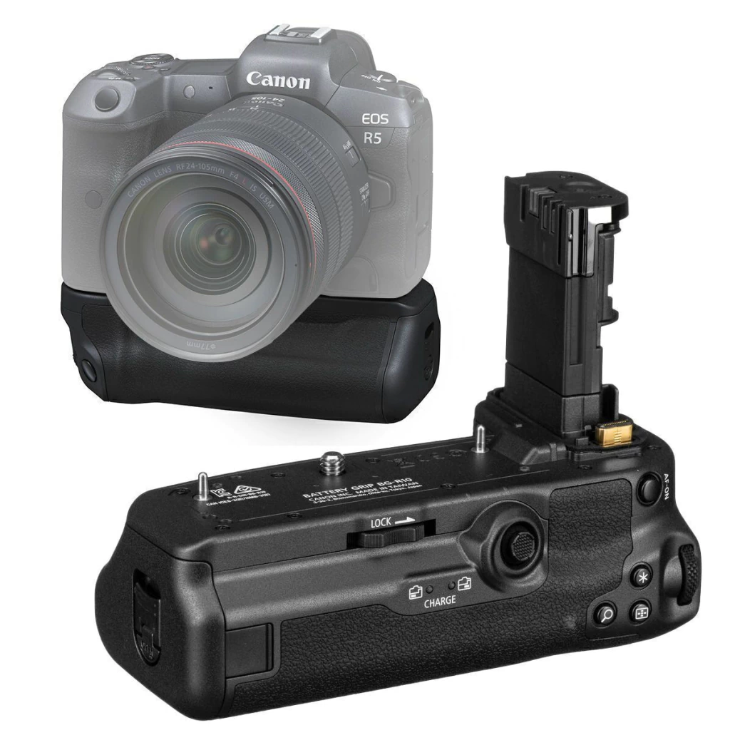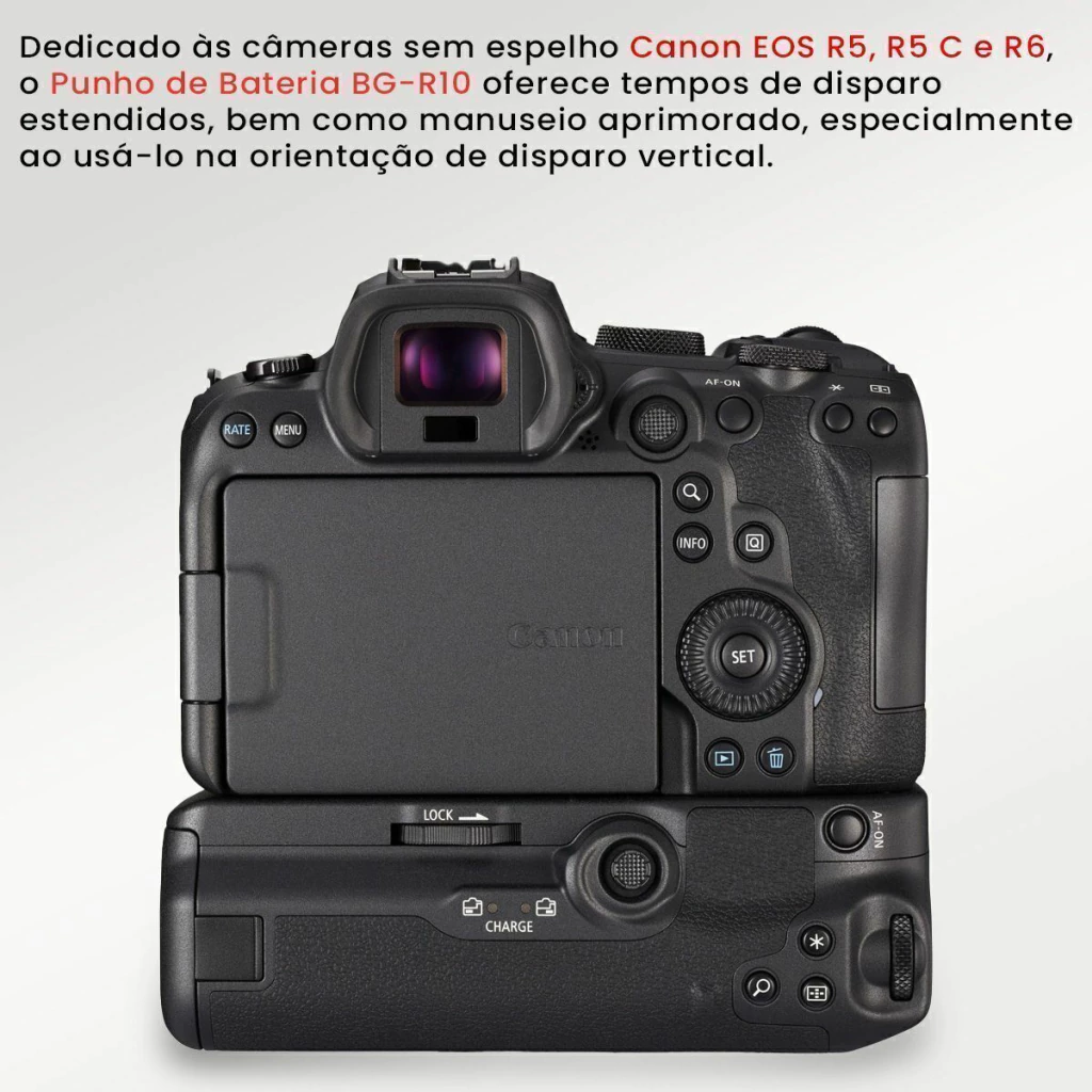Dedicado às câmeras sem espelho Canon EOS R5, R5 C e R6, o Punho de Bateria BG-R10 oferece tempos de disparo estendidos, bem como manuseio aprimorado, especialmente ao usá-lo na orientação de disparo vertical. O design do punho permite trabalhar com duas baterias LP-E6NH/LP-E6N/LP-E6 para efetivamente dobrar a vida útil da bateria.