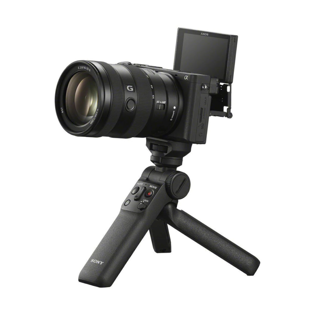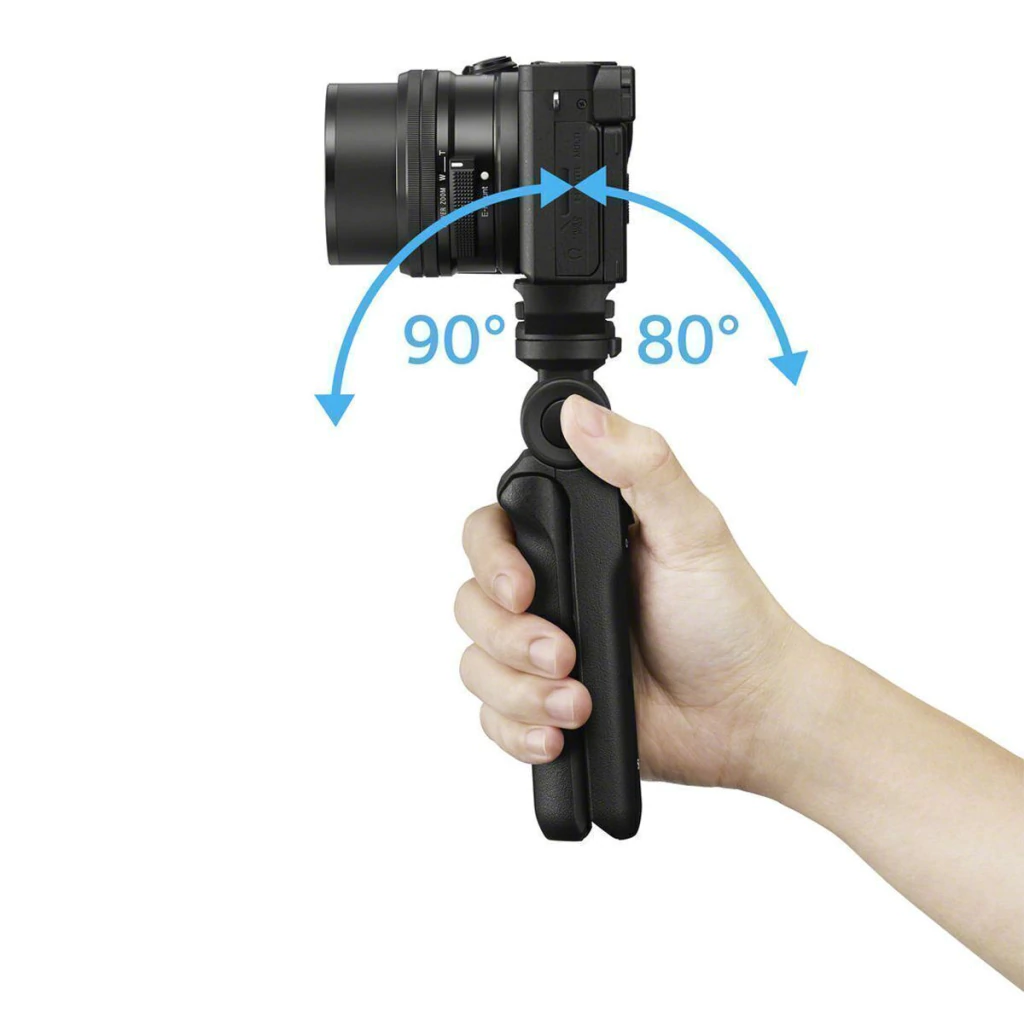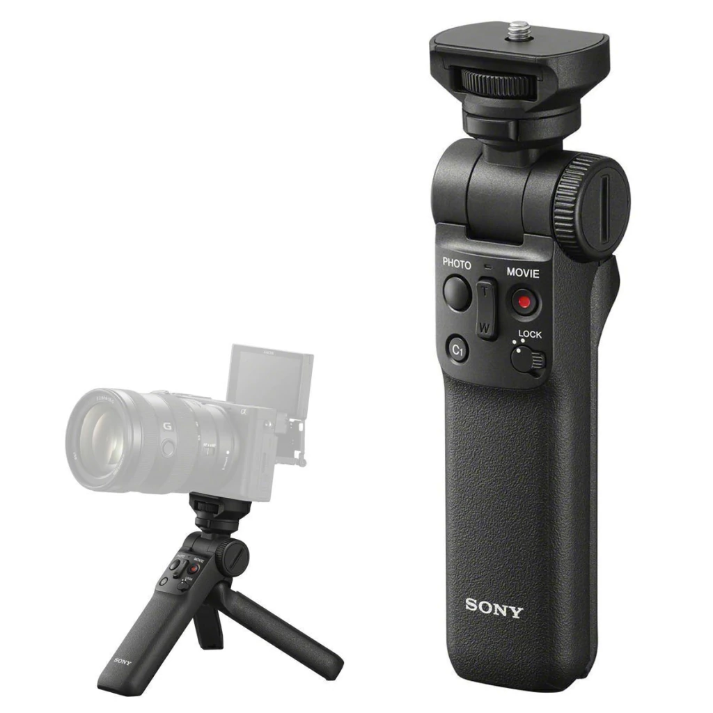 Ajudando a melhorar a estabilidade da filmagem, o punho de disparo sem fio Sony GP-VPT2BT é uma ferramenta conveniente que serve tanto como um punho maior para fotografar com a mão quanto como um elegante tripé de mesa.