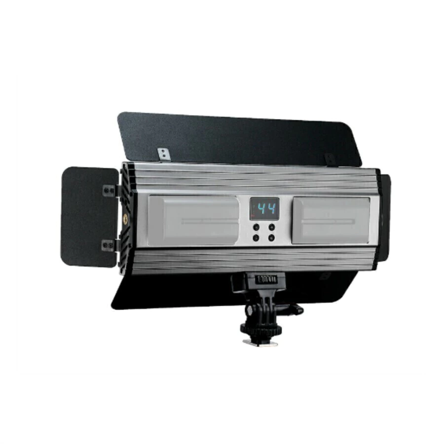 A luz opera na fonte de alimentação CC externa e também aceita baterias recarregáveis modelo de montagem NP-F.