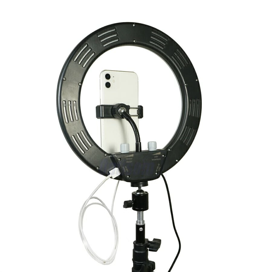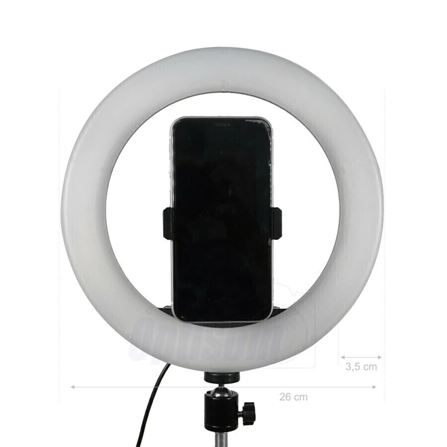 Ring light 10 polegadas articulado (aproximadamente 26 cm) com suporte para smartphone, tomada USB para carregamento do smartphone e tem ajuste te intensidade e temperatura de cor !