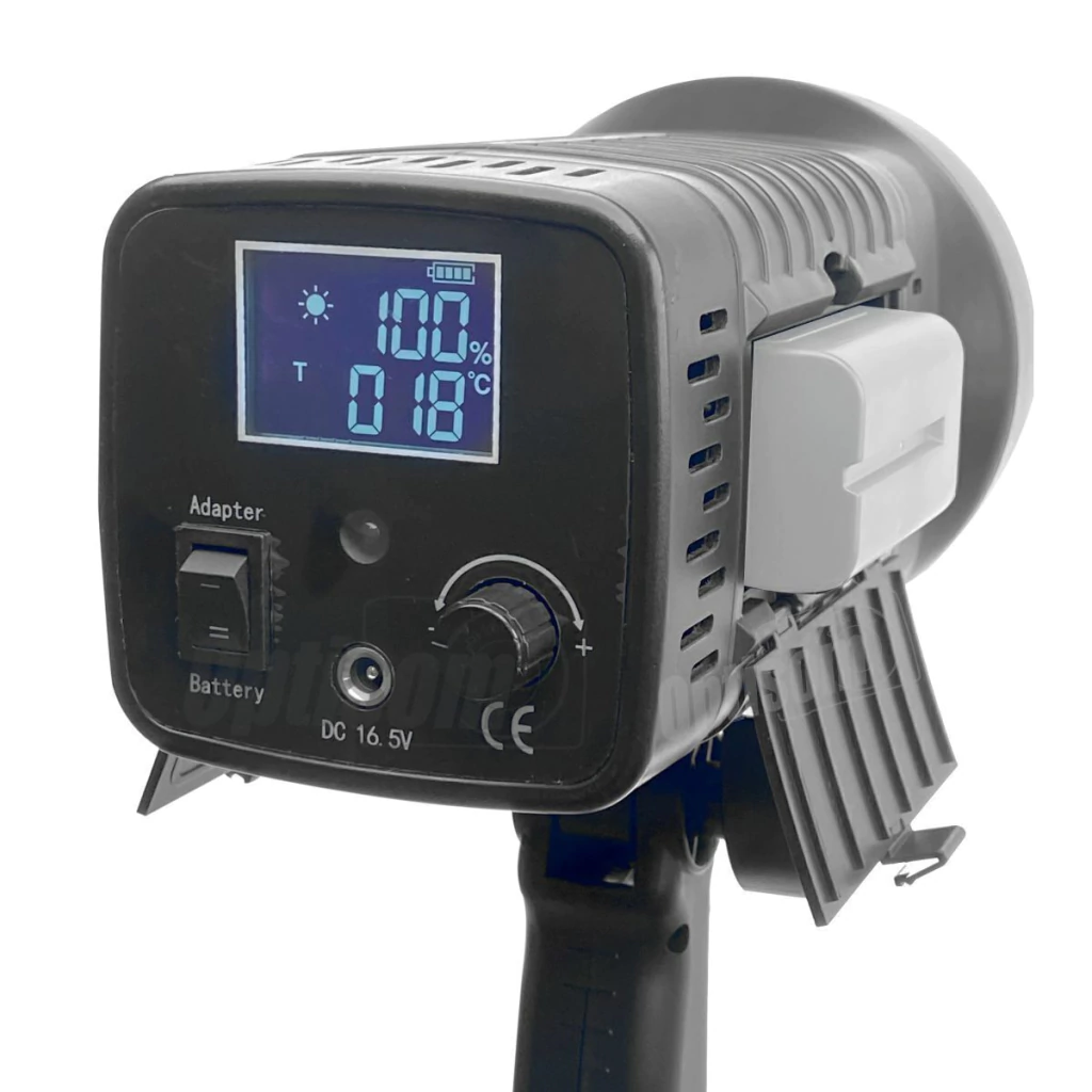 Luz branca (day light) com ajuste de intensidade e controle de temperatura através de filtros laranja e azul incluso, além de um difusor branco.
