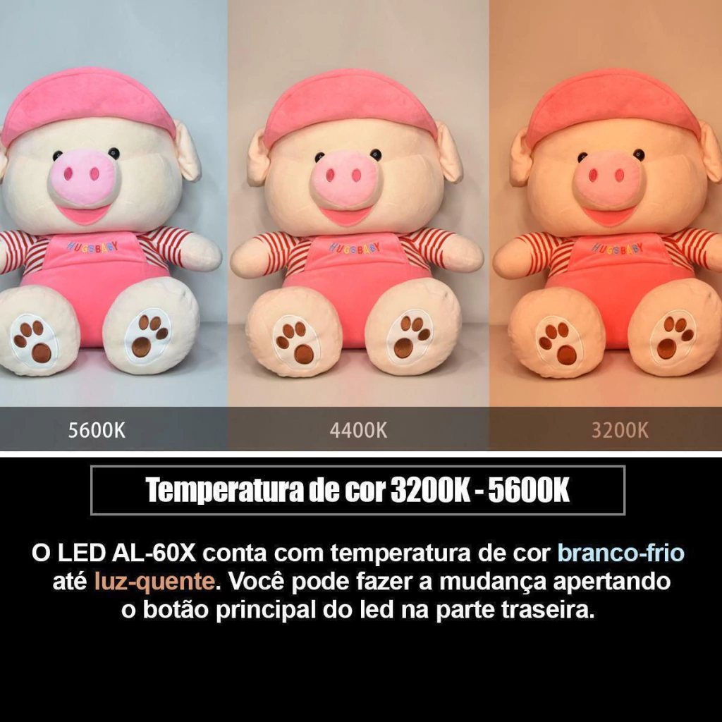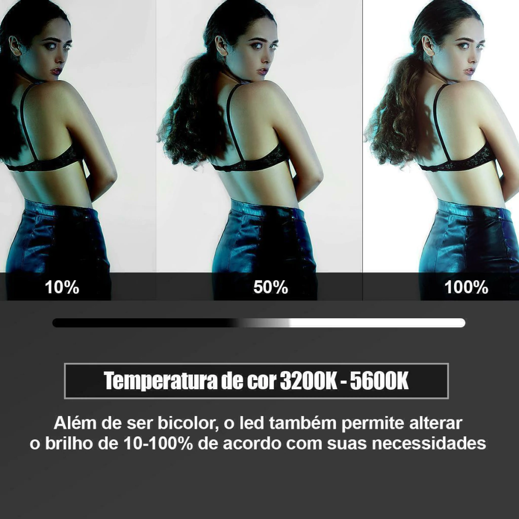 O iluminador possui um ajuste de temperatura de cor 3200K até 5600K e intensidade da luz de 10 - 100%.