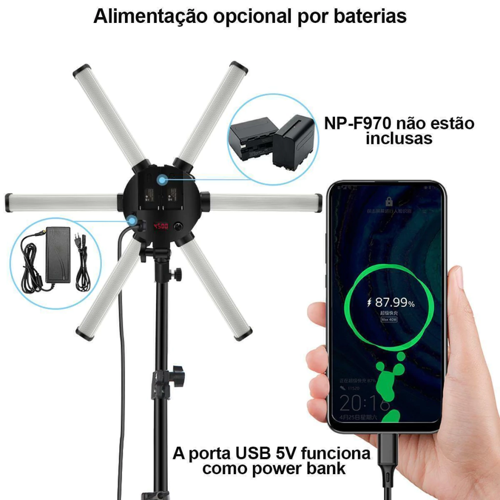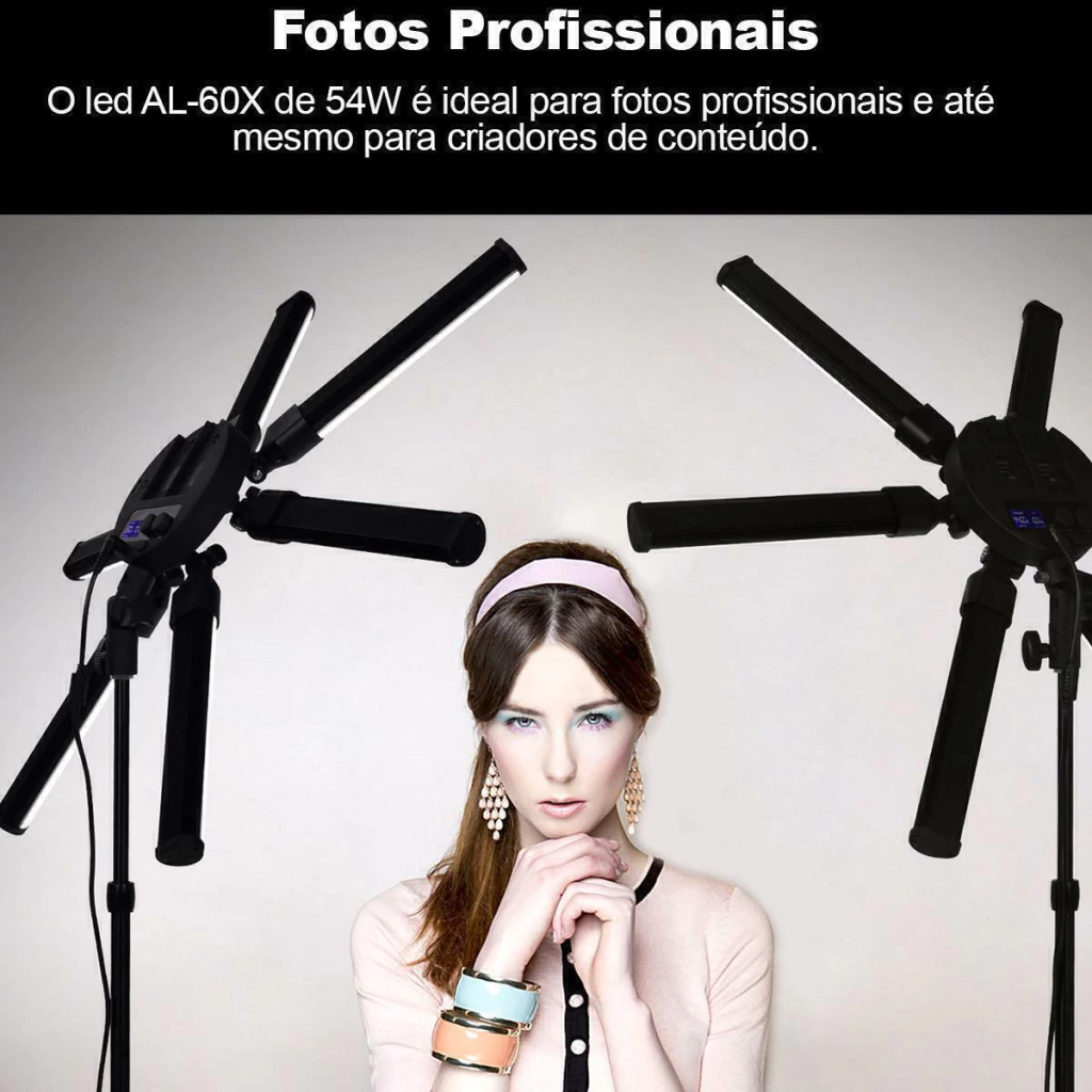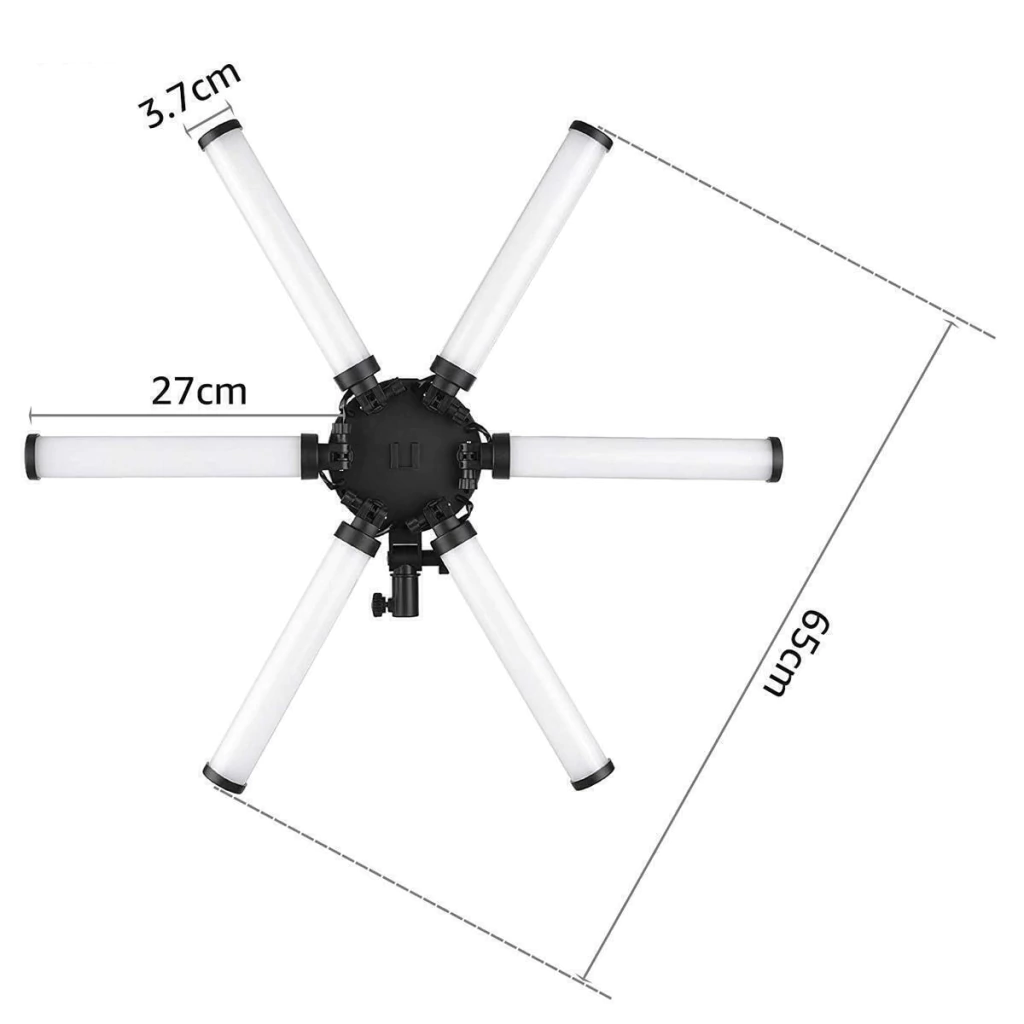 Este iluminador bicolor tubular dobrável possui 6 lâmpadas de 9W cada, sendo um total de 54W de potência, a principal característica desse iluminador é a capacidade de fornecer iluminação adequada para diversos usos tais como; fotos de tatuagens, vídeos de maquiagens, estúdios de estéticas, manicures e outros semelhantes.