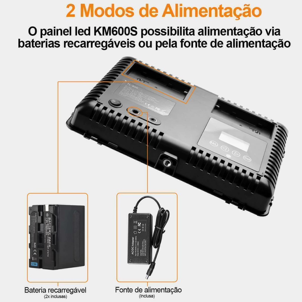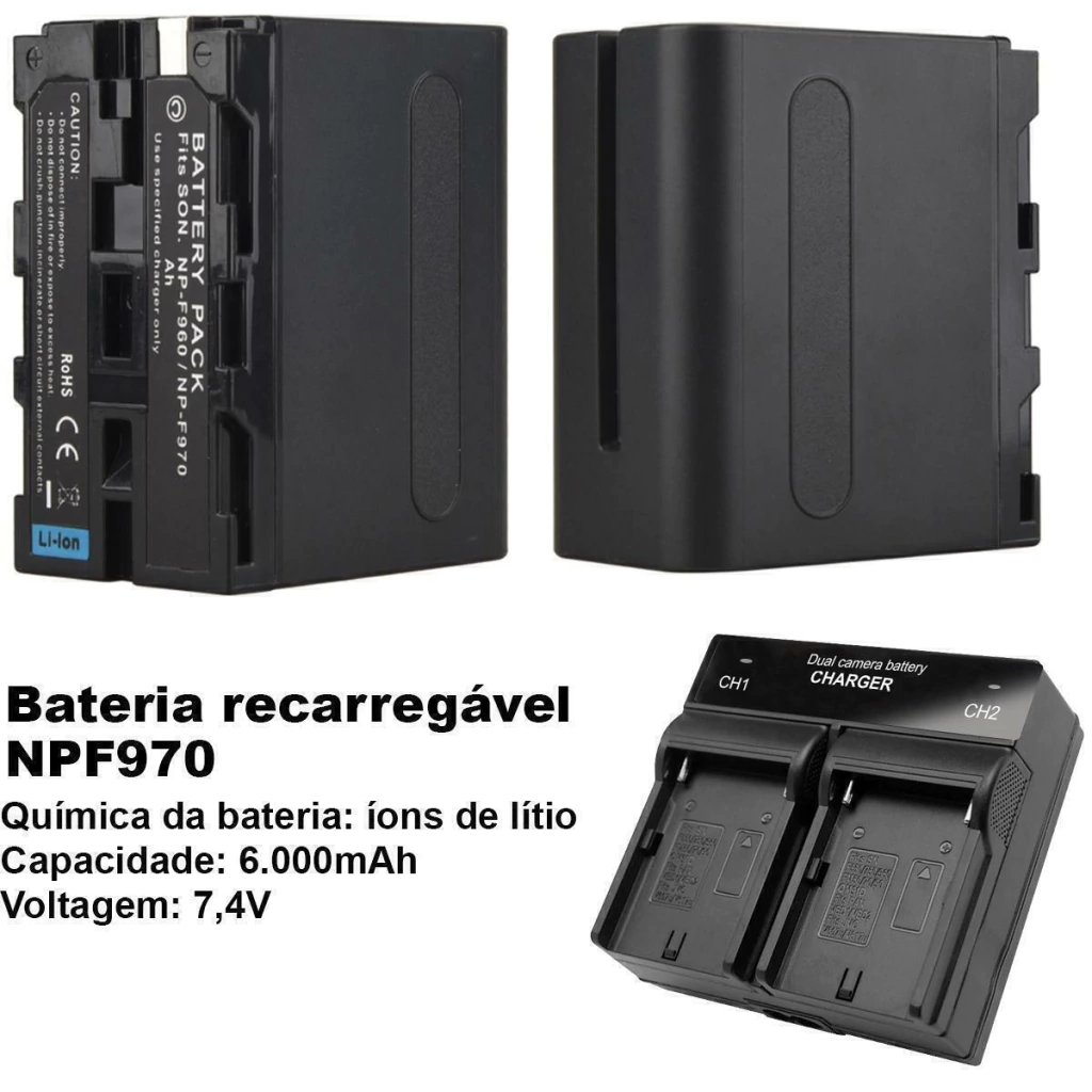 Vem acompanhado de duas baterias F970 de aproximadamente 2400 mAh 7.4V e carregador. Ele pode ser alimentado por uma fonte de alimentação externa AC-DC 12AV (inclusa).