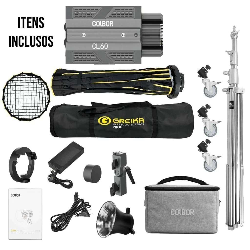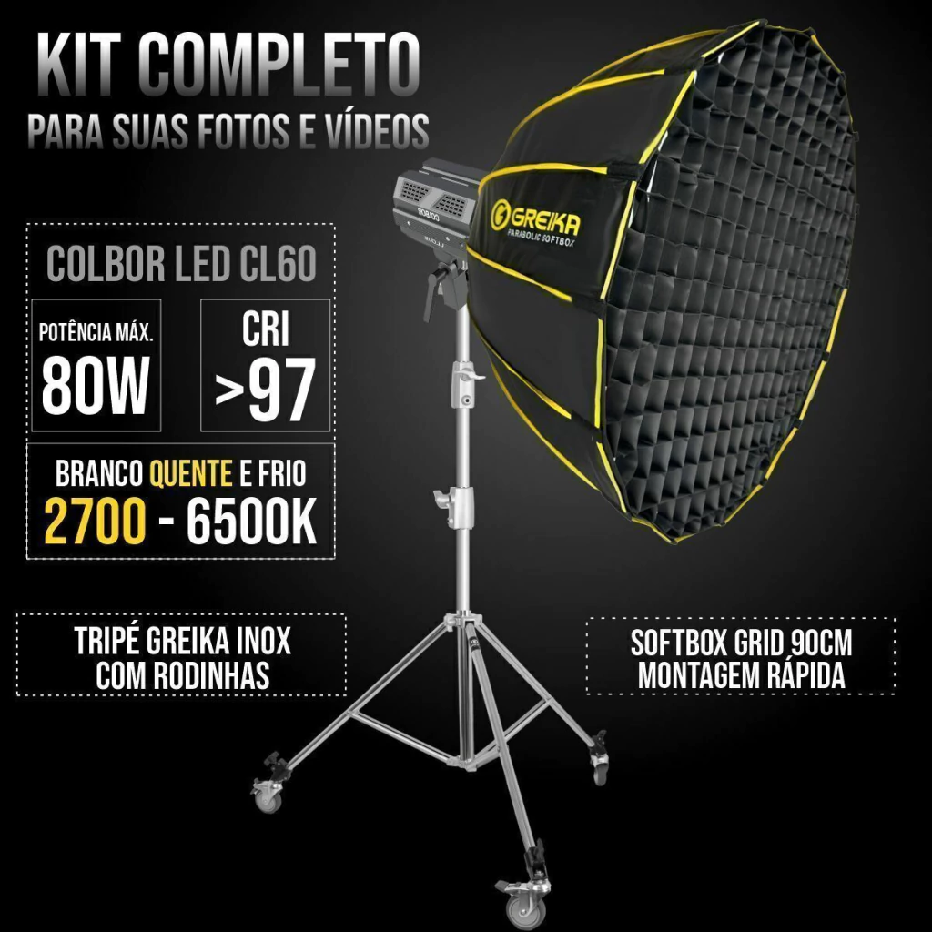 Branco Frio) + SOFTBOX Montagem Rápida com Grid 90cm Greika + TRIPÉ GREIKA INOX