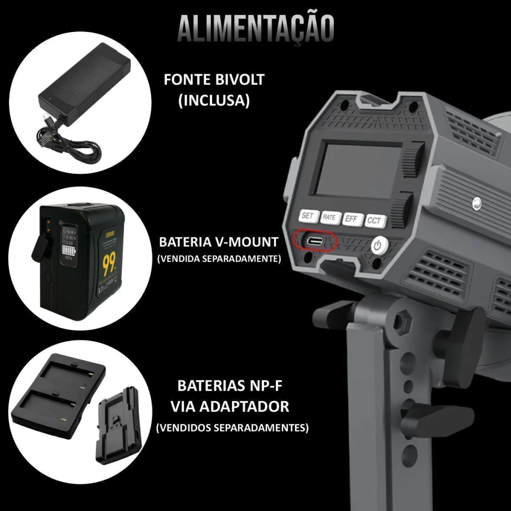 V-MOUNT (vendida à parte) ou baterias np-f (vendidos à parte);