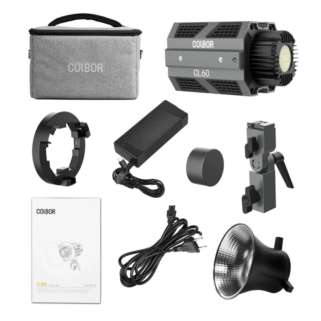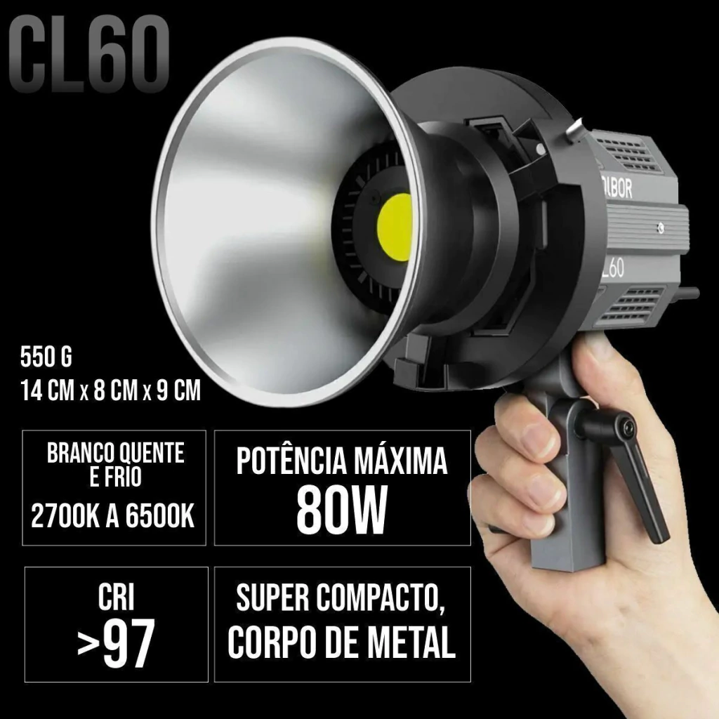 Iluminador COLBOR CL60 com luz que varia de branco quente a branco frio (2700k a 6500K) e potência máxima de 80W.