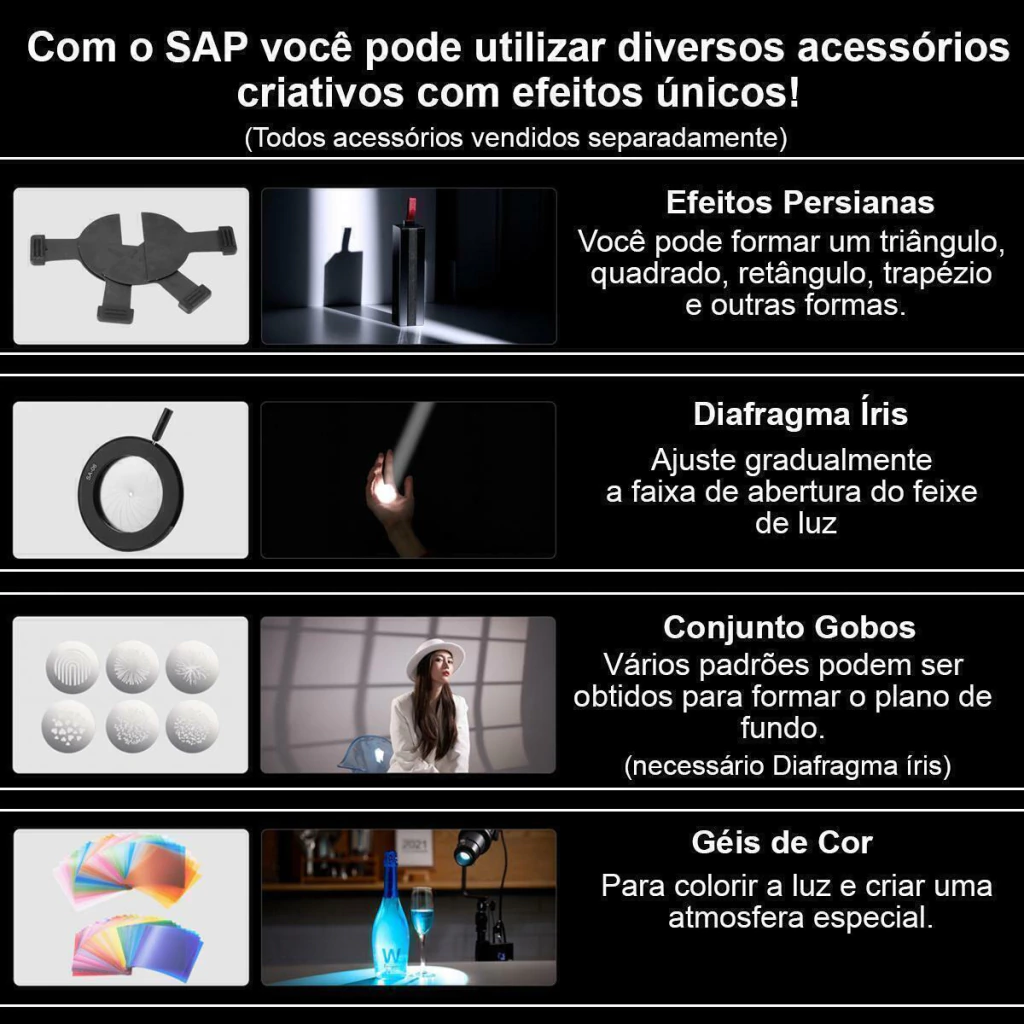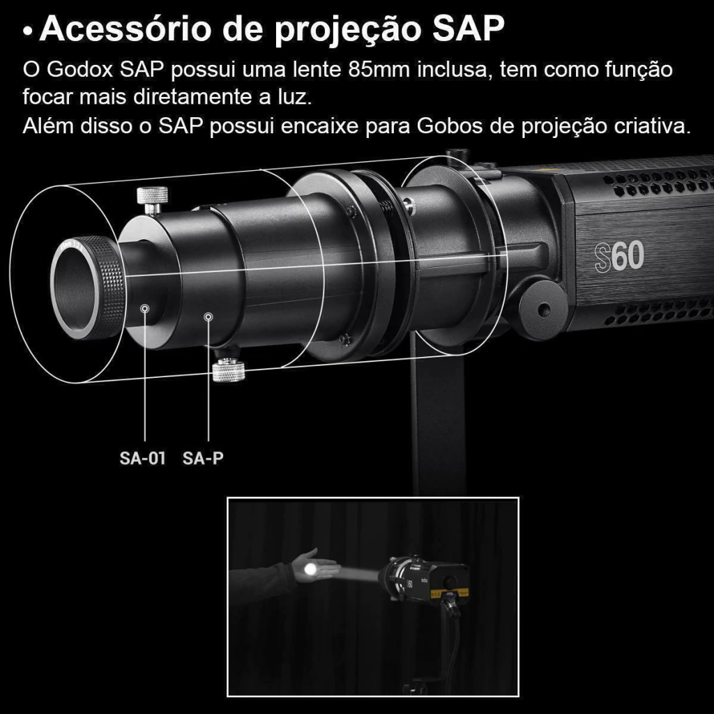O projetor SA-P da Godox serve para focalizar ainda mais a luz, podendo até deixar um único ponto de assunto, o SA-P também pode projetar formas únicas com a junção de gobos e acessórios criativos.