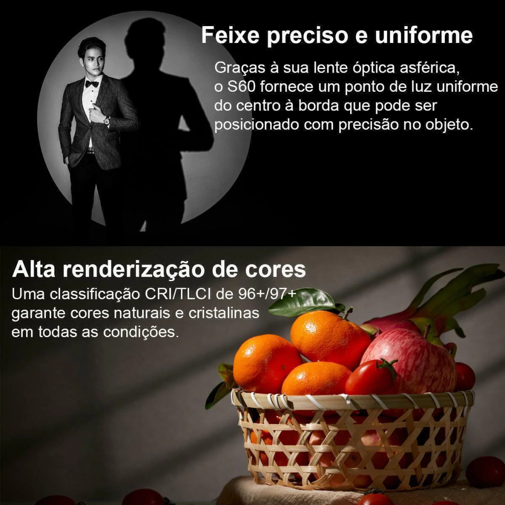 Uma lente óptica esférica fornece as classificações S60 CRI/TLCI de 96+/97+ e garante cores naturais e cristalinas em qualquer aplicação. A intensidade da luz do ponto focado produz um aumento de cerca de 4 pontos em relação à configuração de inundação. Também oferece brilho ajustável de 1-100% para controle mais flexível.