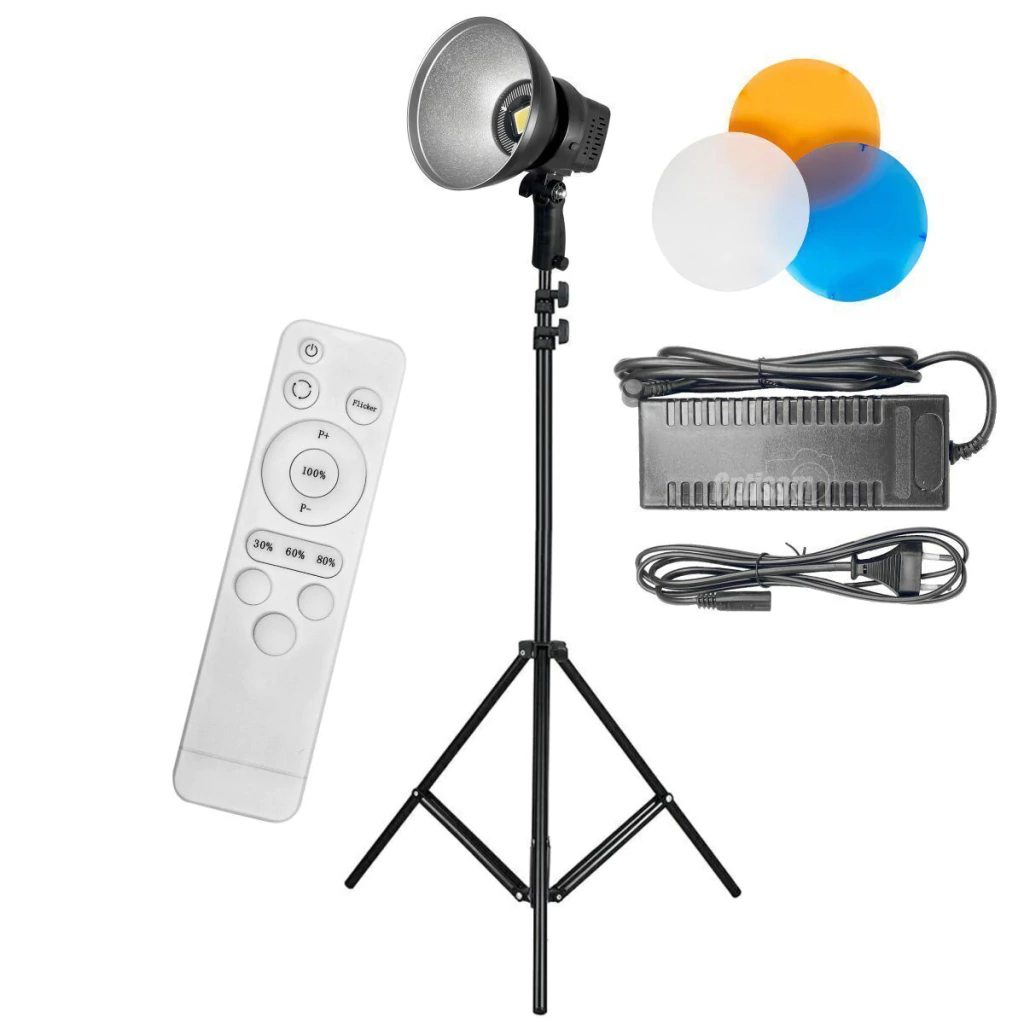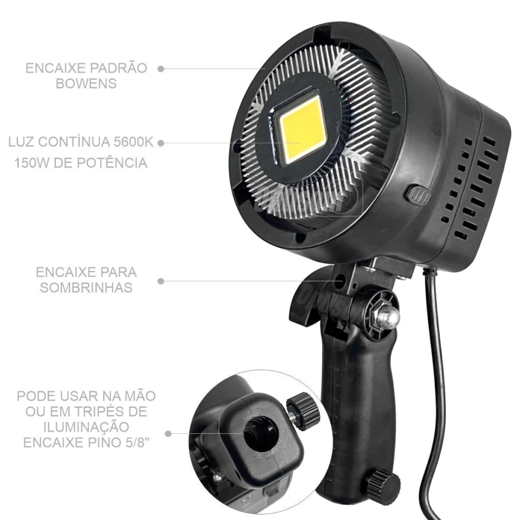 Kit completo Iluminador de LED luz contínua de 150W bivolt Branco Frio com filtros para ajuste de temperatura e controle remoto, ideal para fotos e vídeos.