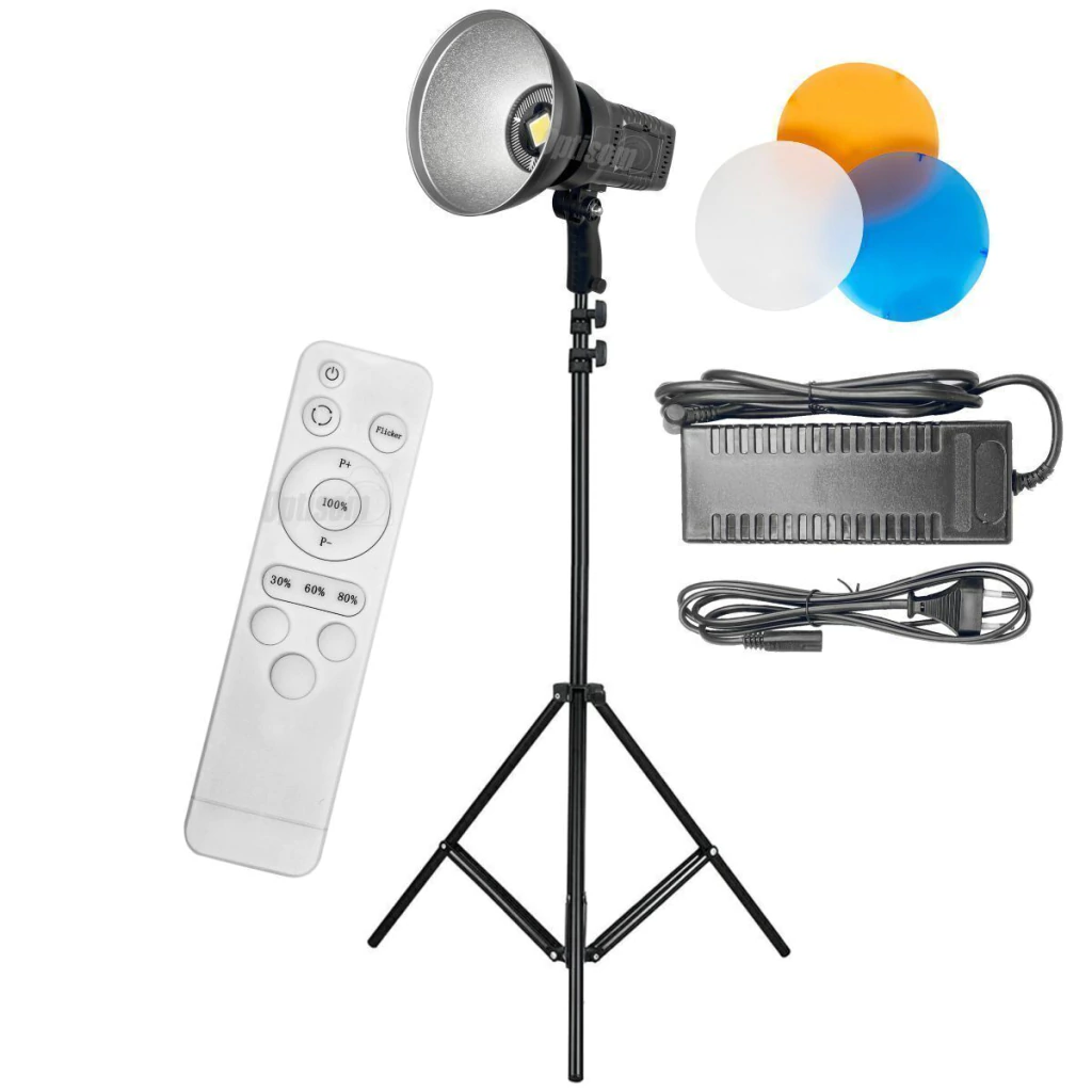 Luz branca (day light) com ajuste de intensidade e controle de temperatura através de filtros laranja e azul incluso, além de um difusor branco.