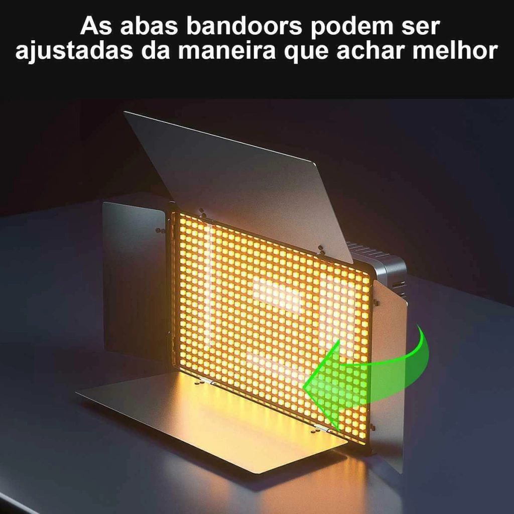 Possui abas barndoors de alumínio para direcionar a luz, possui dois botões dimmer sendo um para controle da intensidade da temperatura 3200K a e outro para controlar a temperatura de 5600K.