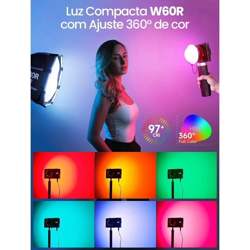 A luz de vídeo LED portátil COLBOR 60W inclui o W60R RGB. O W60R adota LED RGBCW para oferecer opções de iluminação em cores completas.