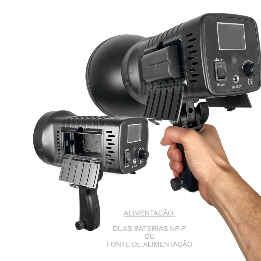 Pode usar tanto na mão quanto em tripés de iluminação pino 5/8".