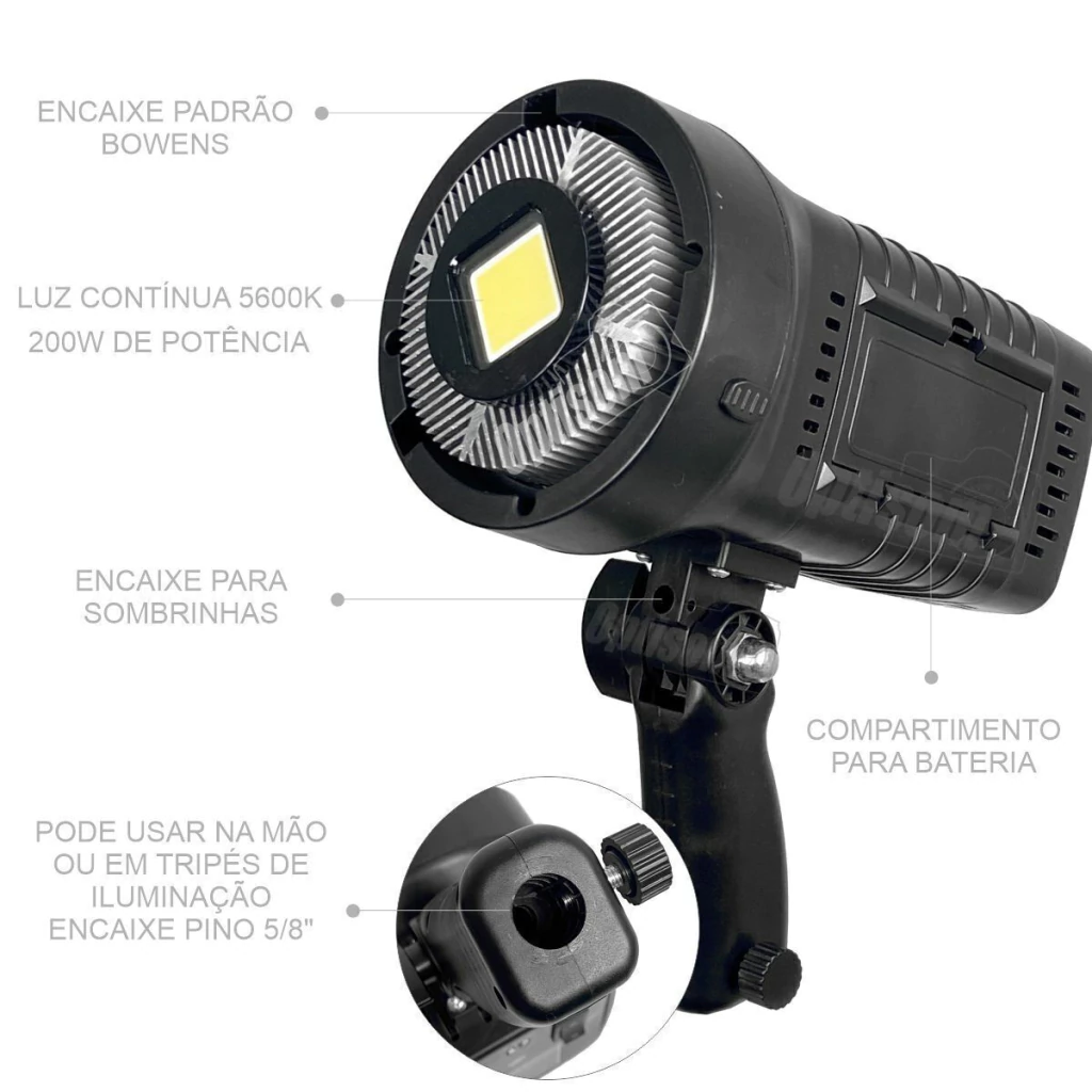 Iluminador de LED luz contínua de 200W bivolt COMPATÍVEL COM BATERIAS NP-F, luz Branca Fria com filtros para ajuste de temperatura e controle remoto, ideal para fotos e vídeos.