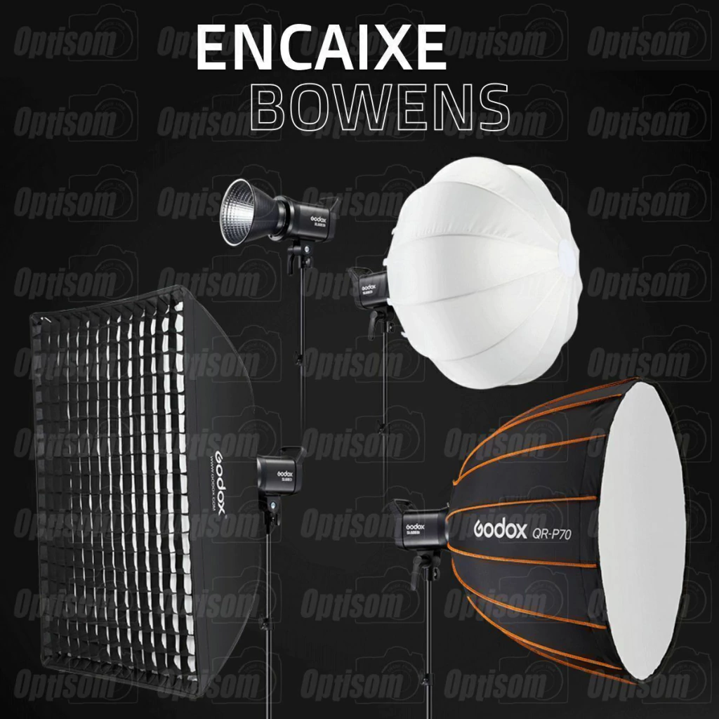 A montagem de acessório frontal Bowens permite o uso de modificadores Godox e os de muitos fabricantes que usam essa montagem popular