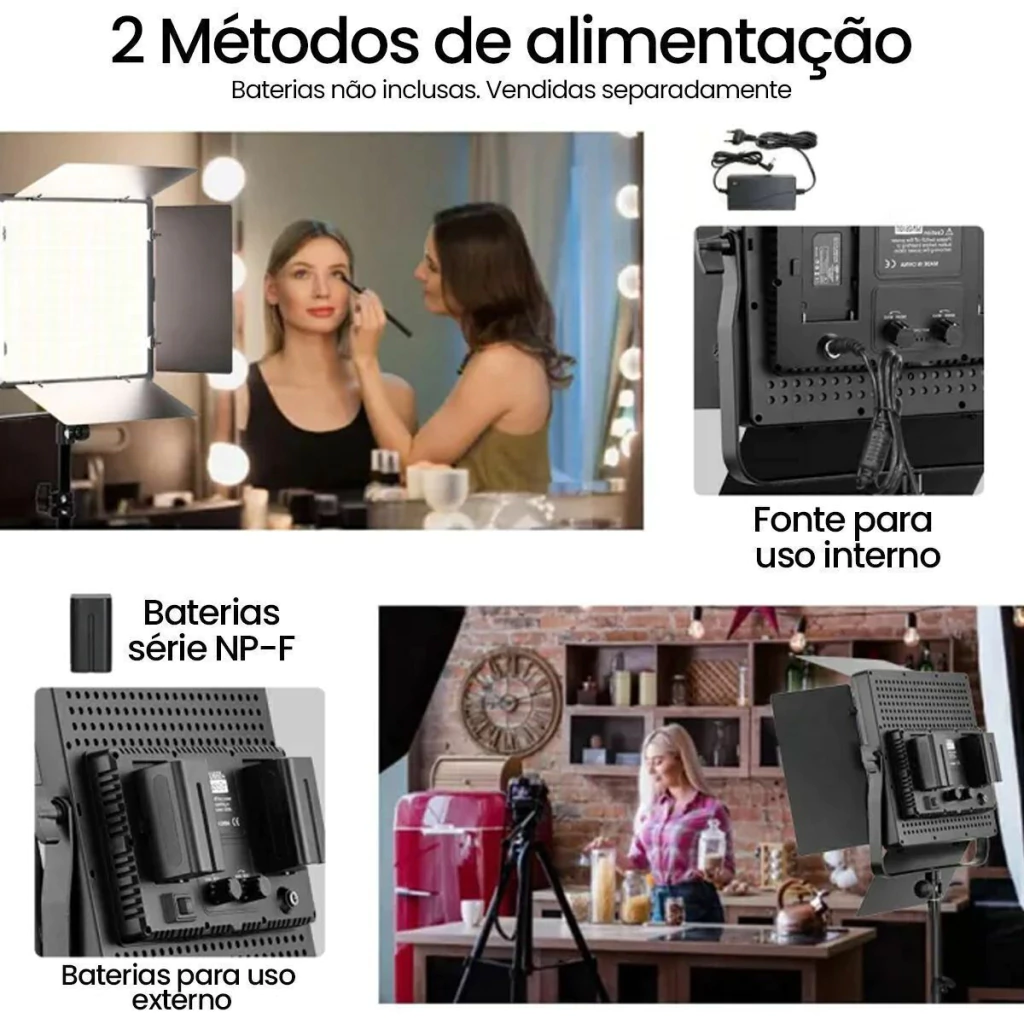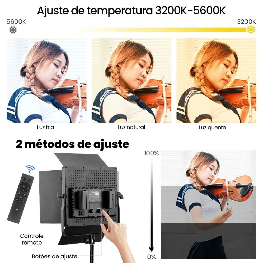 Possui abas barndoors de alumínio para direcionar a luz e botões dimmer para controlar a temperatura da luz de 3200K - 5600K. Um controle remoto também está inclusa com este led, facilitando os ajustes de iluminação