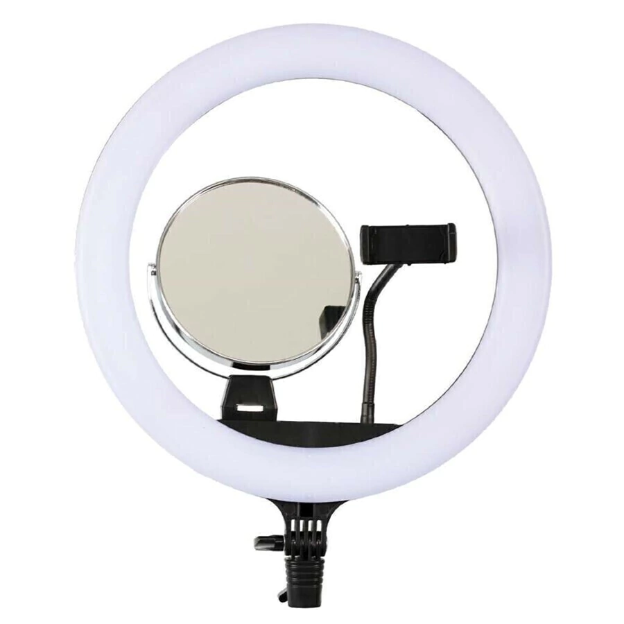 E para complementar ainda mais, esse modelo possui na estrutura de sua base central, 3 roscas de tamanho 1/4, o que possibilita a fixação de acessórios para uso com o ring. E para uma maior qualidade, este iluminador circular acompanha um espelho de dupla face com 14cm de diâmetro e um suporte maleável para encaixe de celular com até 8,5cm de largura, acabando por fornecer, muito mais praticidade durante o uso desse Ring.