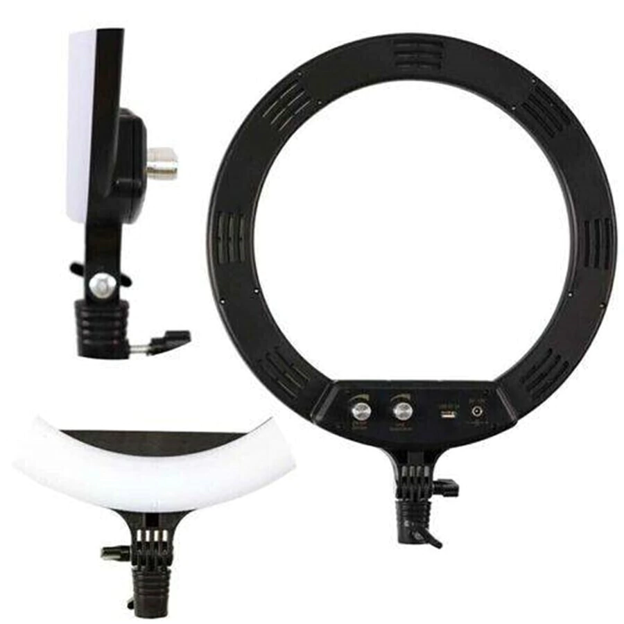 Esse modelo de Ring Light possui uma estrutura composta por um total de 220 leds, onde divide-se em 110 leds para luz quente (2700K) e 110 leds para luz fria (5500K), podendo ajustar a sua temperatura por meio do dimmer na parte traseira do iluminador. Permite também, realizar o ajuste da intensidade da cor a partir de um outro dimmer do ring, variando de 0 a 100%.