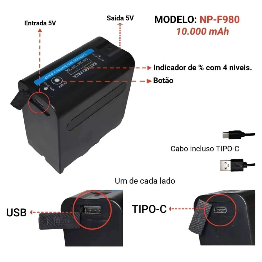 Seu modelo alfanumérico NP-F980 e sua voltagem de 7.4V garantem compatibilidade com uma variedade de equipamentos.