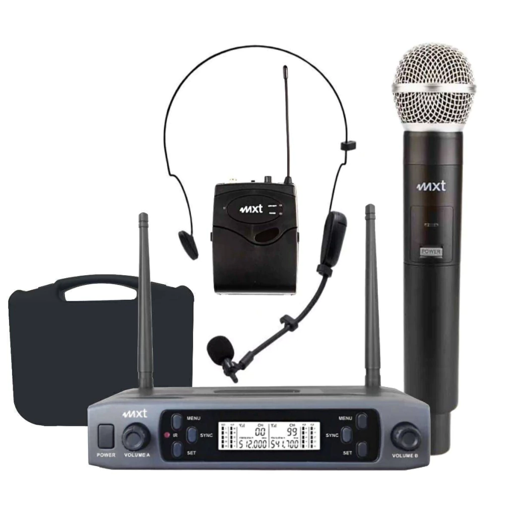 Modelo 2 em 1, headset e um microfone de mão incluso.