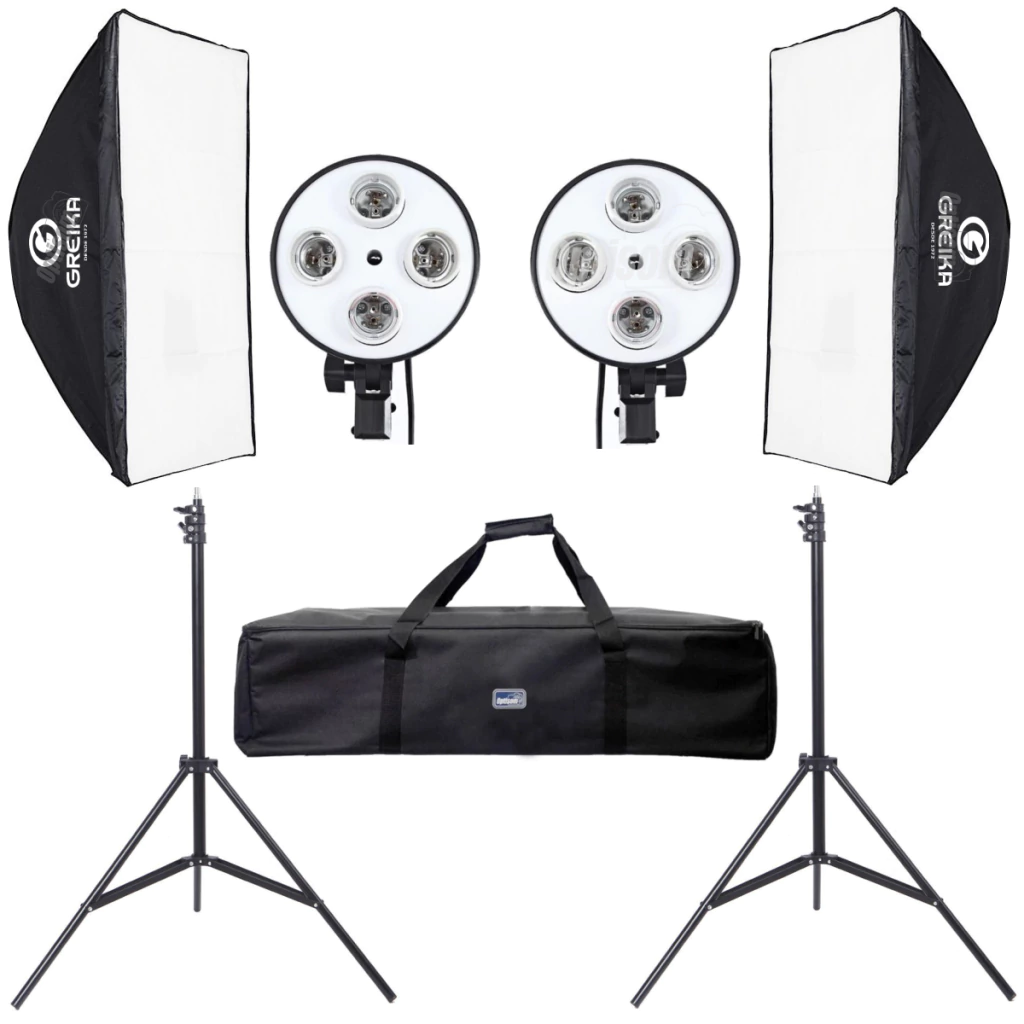 02 Softboxes GREIKA 50x70cm tipo vareta para soquete quádruplo;