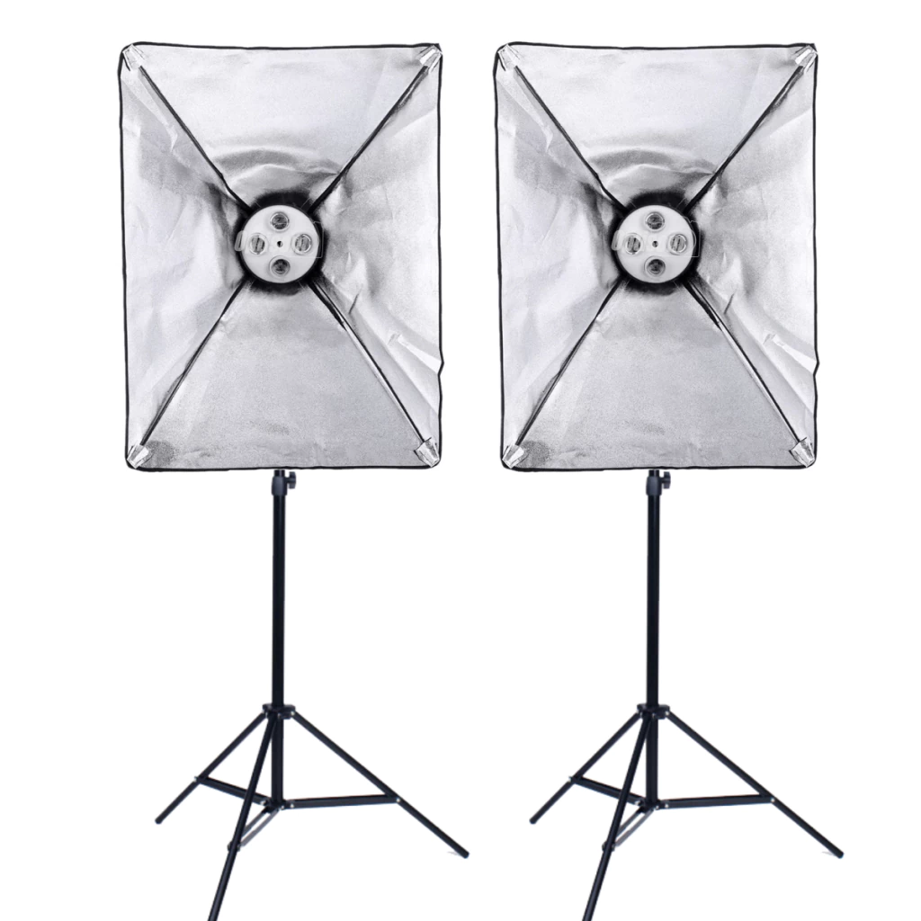 Kit iluminação estúdio Softbox Retangular 50 cm por 70 cm interior tem um tecido reflexivo prata e na frente do softbox uma tela branca translúcida para amenizar a luz, deixar ela mais suave espalhando mais no ambiente.