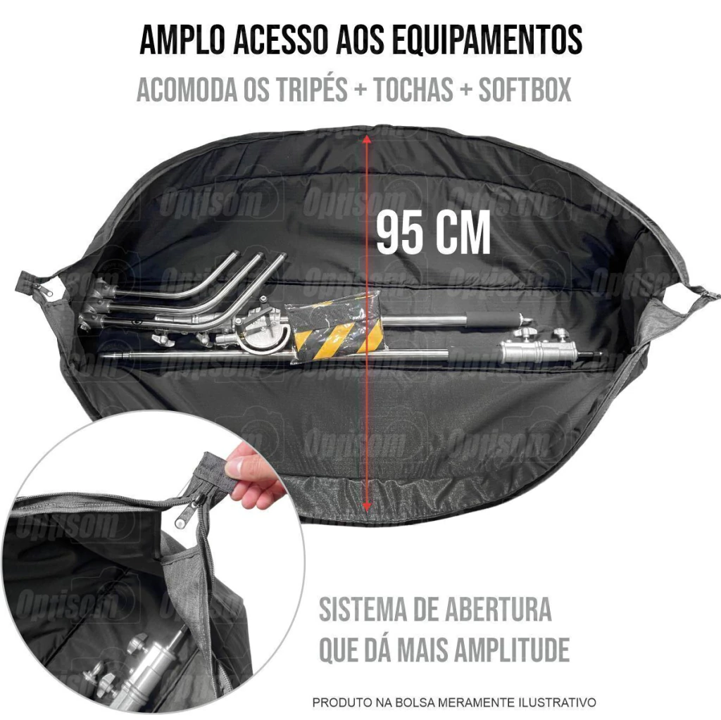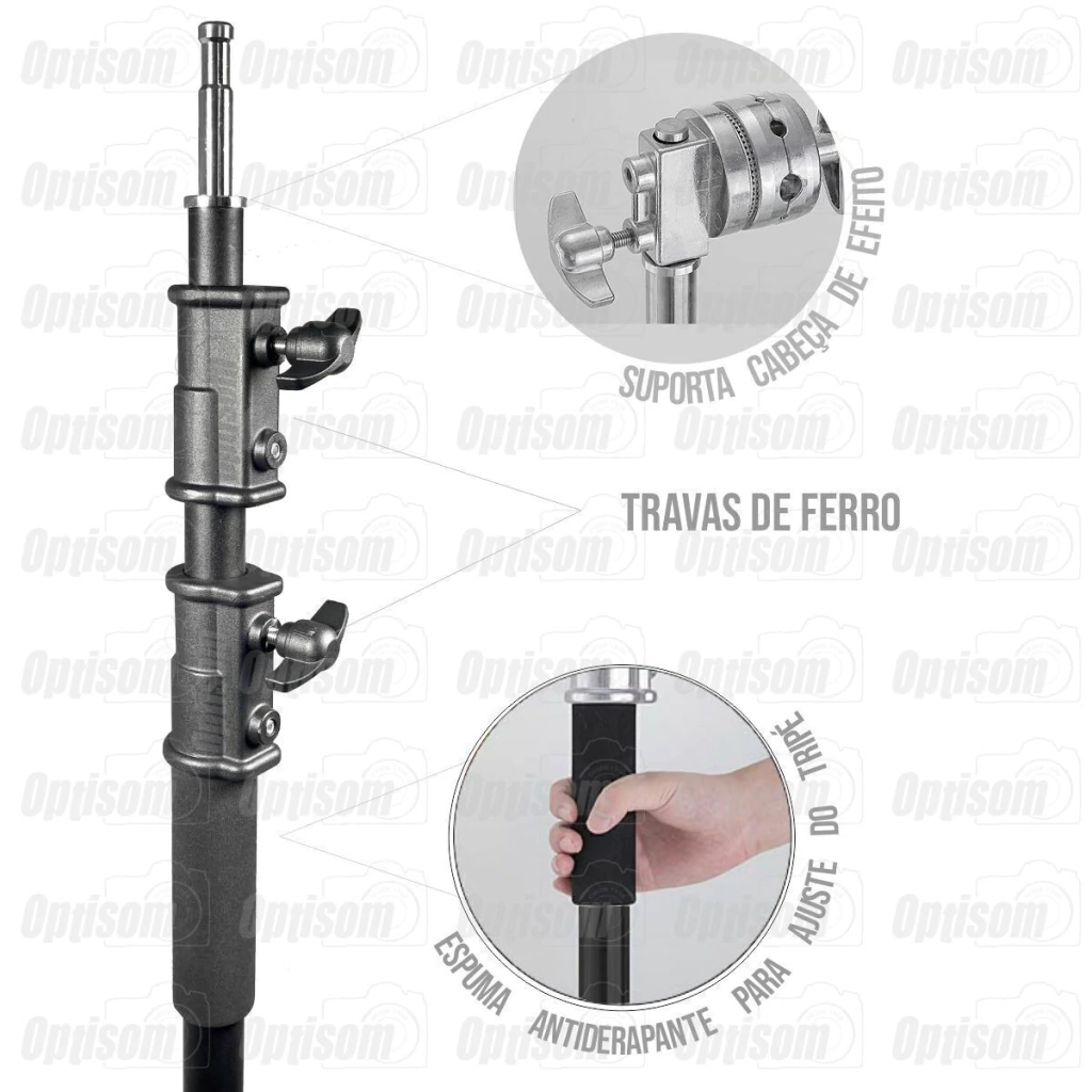 Esse tripé suporta até 30kg e chega a 3,30m de altura.