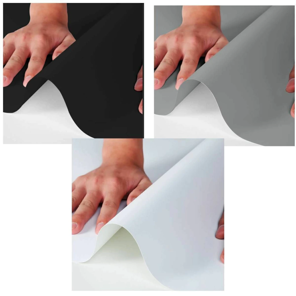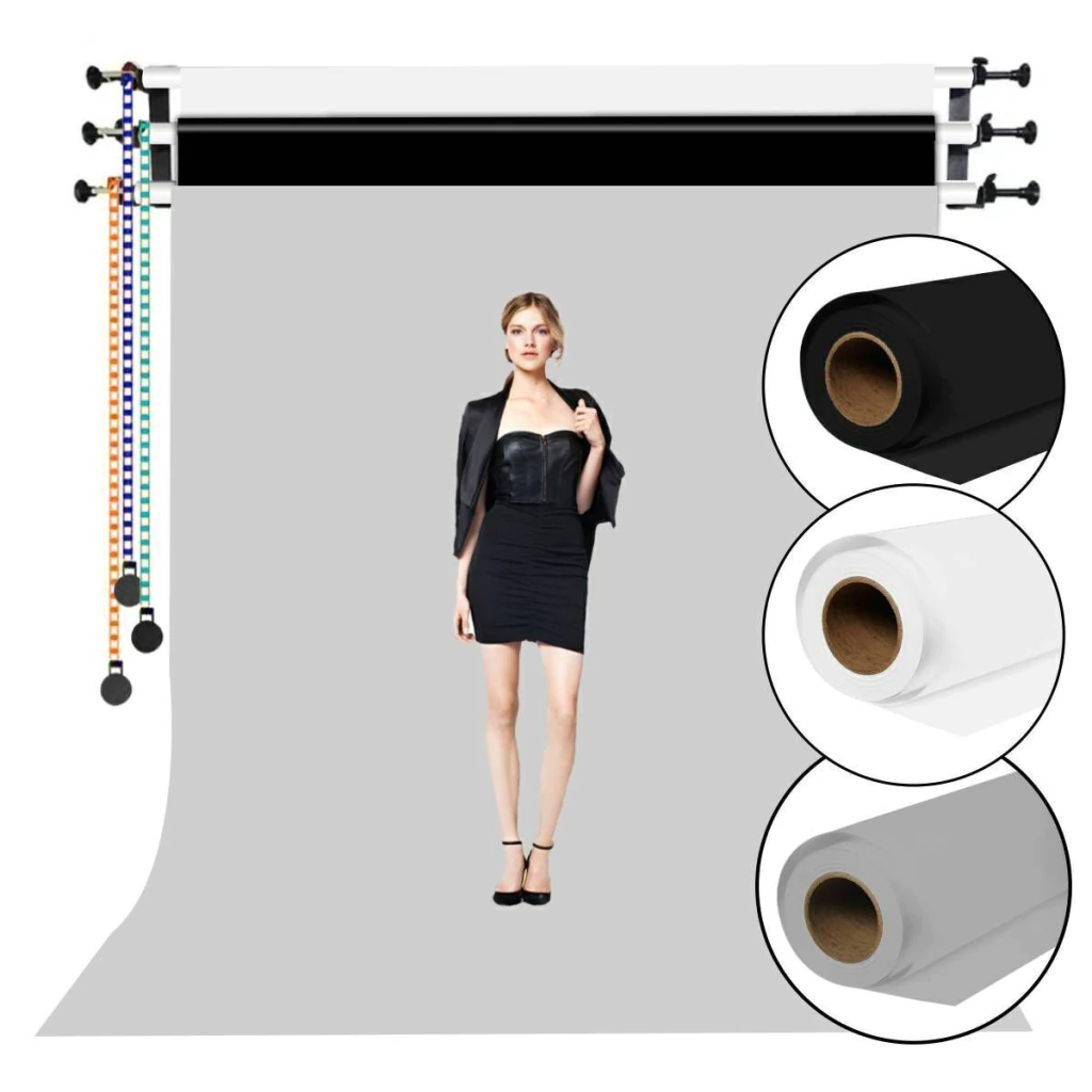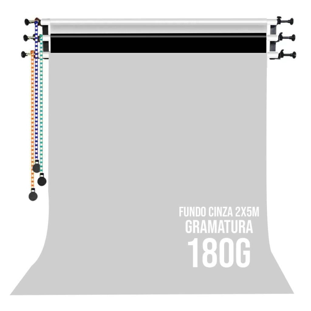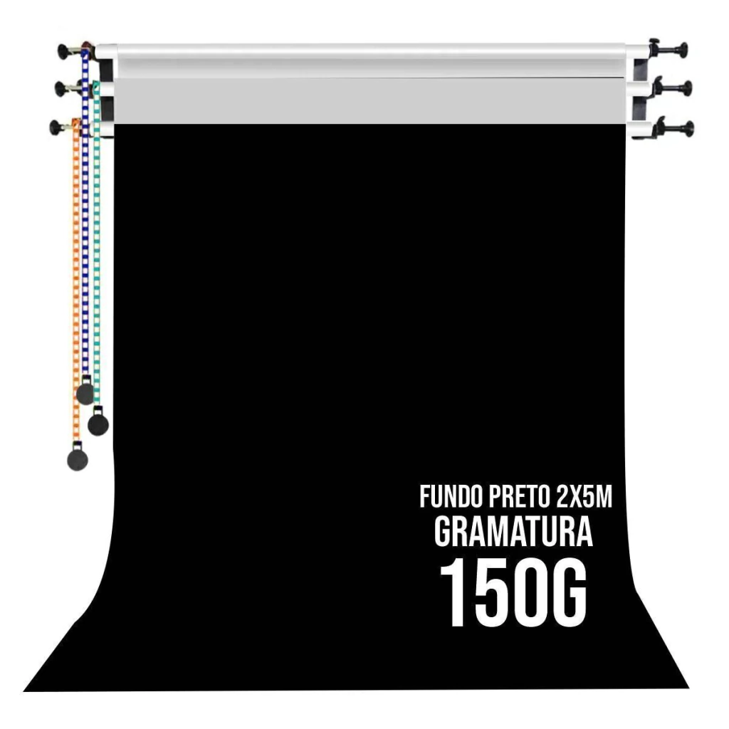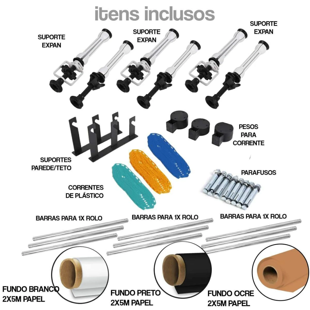 KIT COMPLETO COM FUNDO TRIPLO PAREDE/TETO COM 3 ROLOS DE FUNDO 2X5M (PRETO + BRANCO + CINZA)