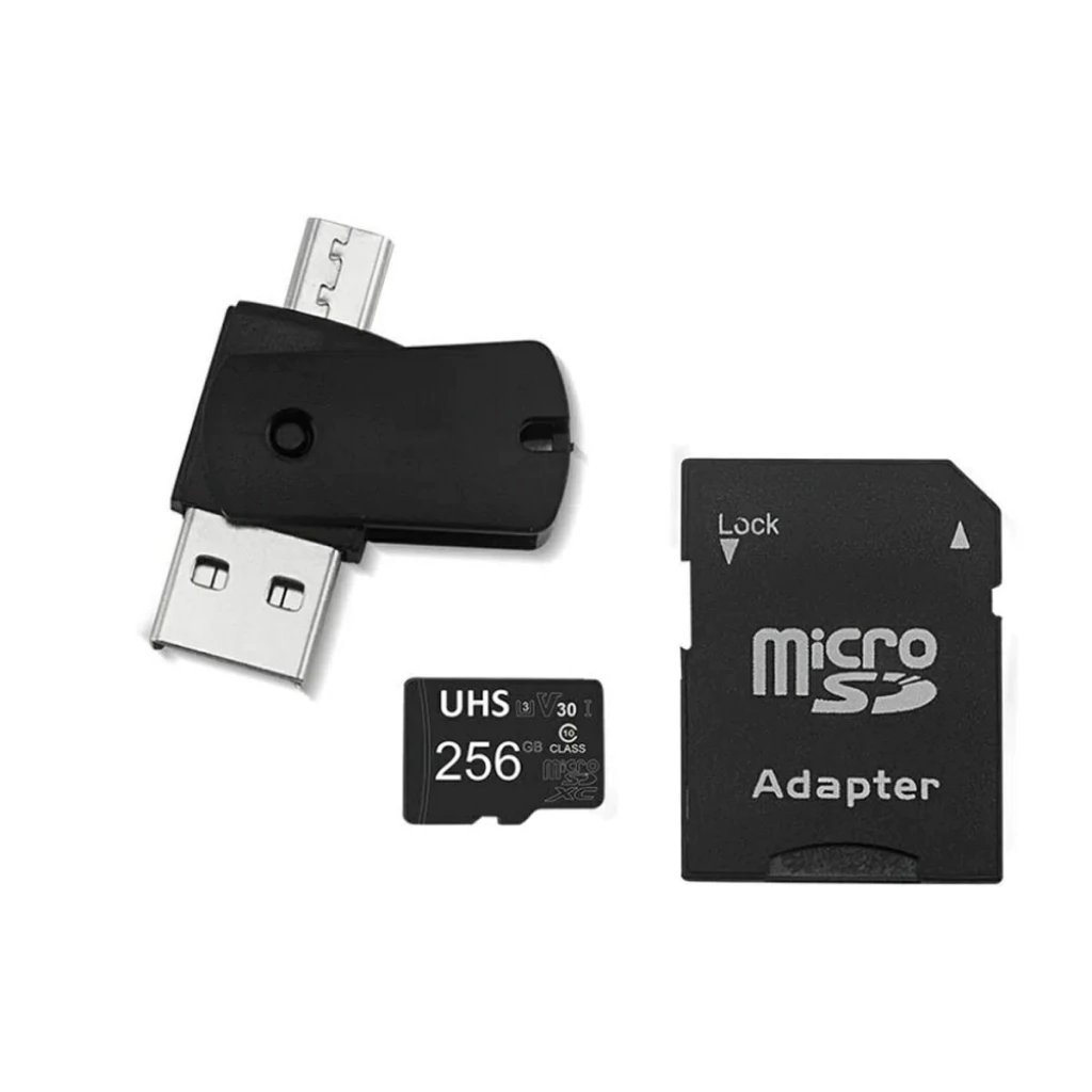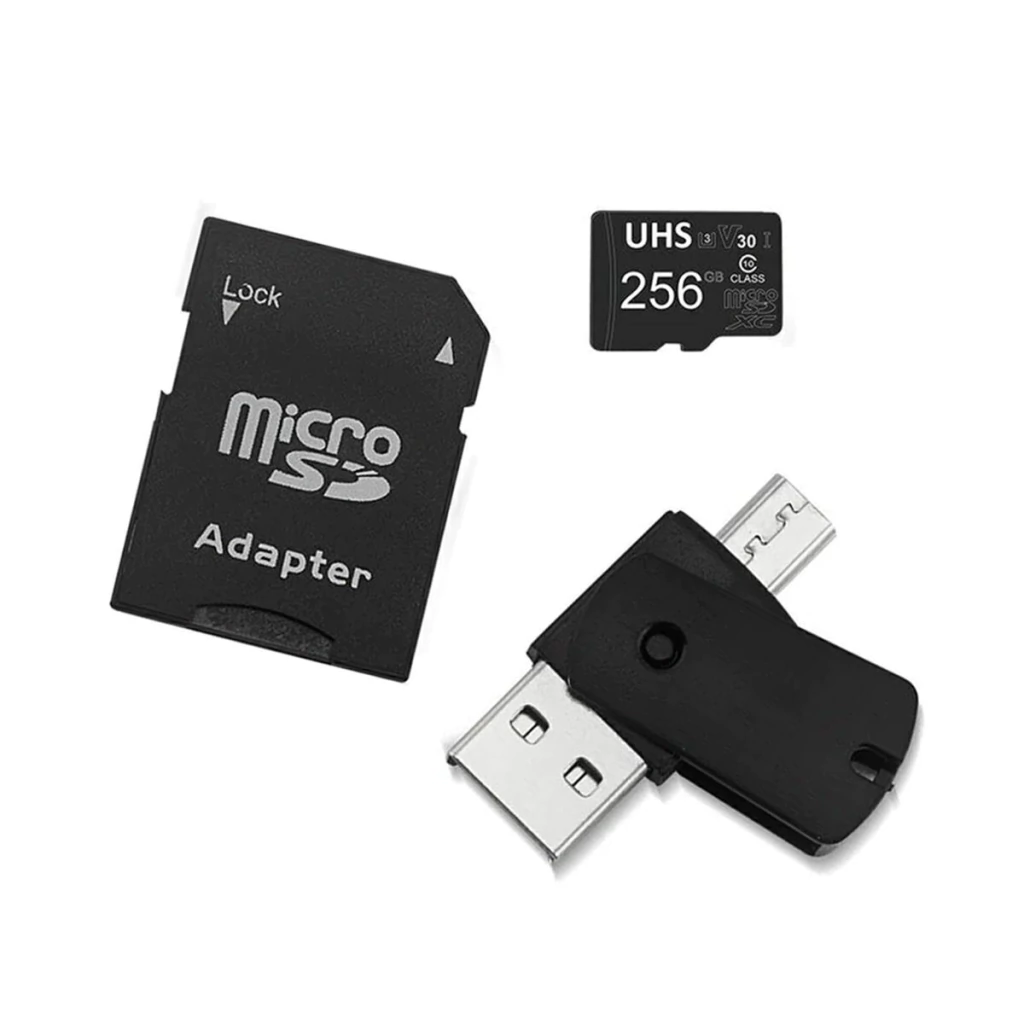 Kit 4 em 1 cartão de memória 256gb ultra high speed-i u3 + adptador USB/OTG tipo-C + adaptador SD - mc154