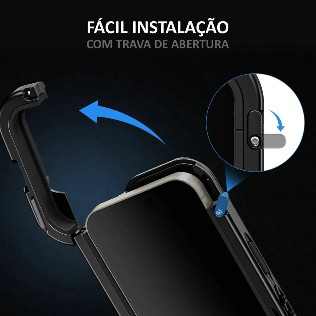 Com um click você abre o cage e desliza seu celular por ele que se ajusta perfeitamente ao sem bloquear a câmera, a porta de carregamento, os botões de função e o carregamento sem fio.