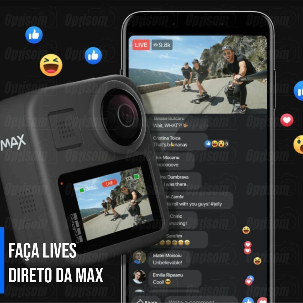 A Gopro MAX suporta transmissão ao vivo para mídias sociais em 1080p.