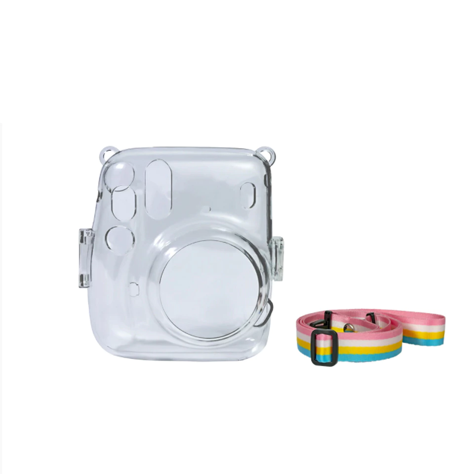Kit acompanha estojo rígido transparente com alça de pescoço colorida e pack com 10 filmes.