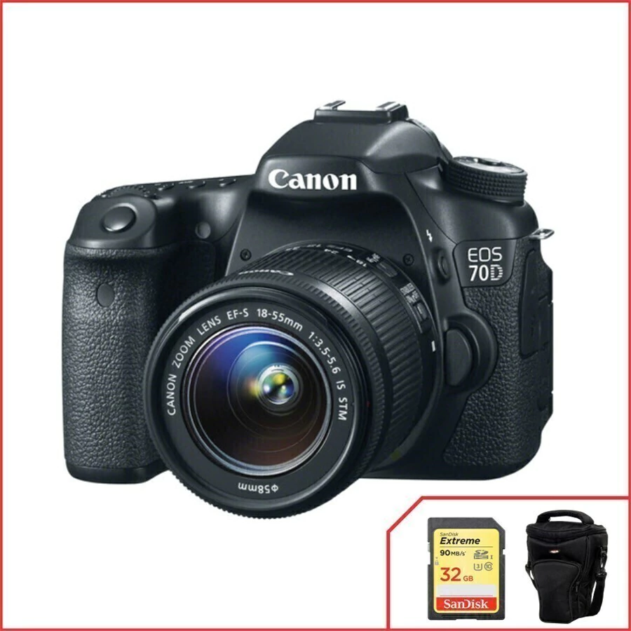 Câmera Canon 70D 20.0 megapixel, com lente 18-55mm f3.5-5.6 IS STM LCD 3", ISO 100-25600, novas funções que prometem melhorar a qualidade de vídeo, auto foco muito mais rápido e decisivo, Wi-Fi de alta resolução. Canon EOS 70D é o seu auto focus baseada no sensor CCD chamado dupla pixel CMOS AF, esta tecnologia tornou-se possível por retrabalhar o desenho do sensor. Em vez de oferecer um fotodiodo por pixel, sensor da 70D tem atribuído dois fotodiodos por pixel. Isso permite que a câmera capture simultaneamente luz e realizar autofoco de detecção de face. Isto significa para o profissional que a câmera é capaz de concentrar-se mais rápido e com mais precisão a focagem automática completa para funcionar sem problemas e com precisão durante a gravação de vídeos. As imagens estáticas podem ser transferidos entre duas câmeras Canon wireless habilitados através de uma rede de área local (LAN) e pode ser carregado via imagem Canon Gateway e impressos diretamente em uma impressora PictBridge sem fio sem a necessidade de um PC.