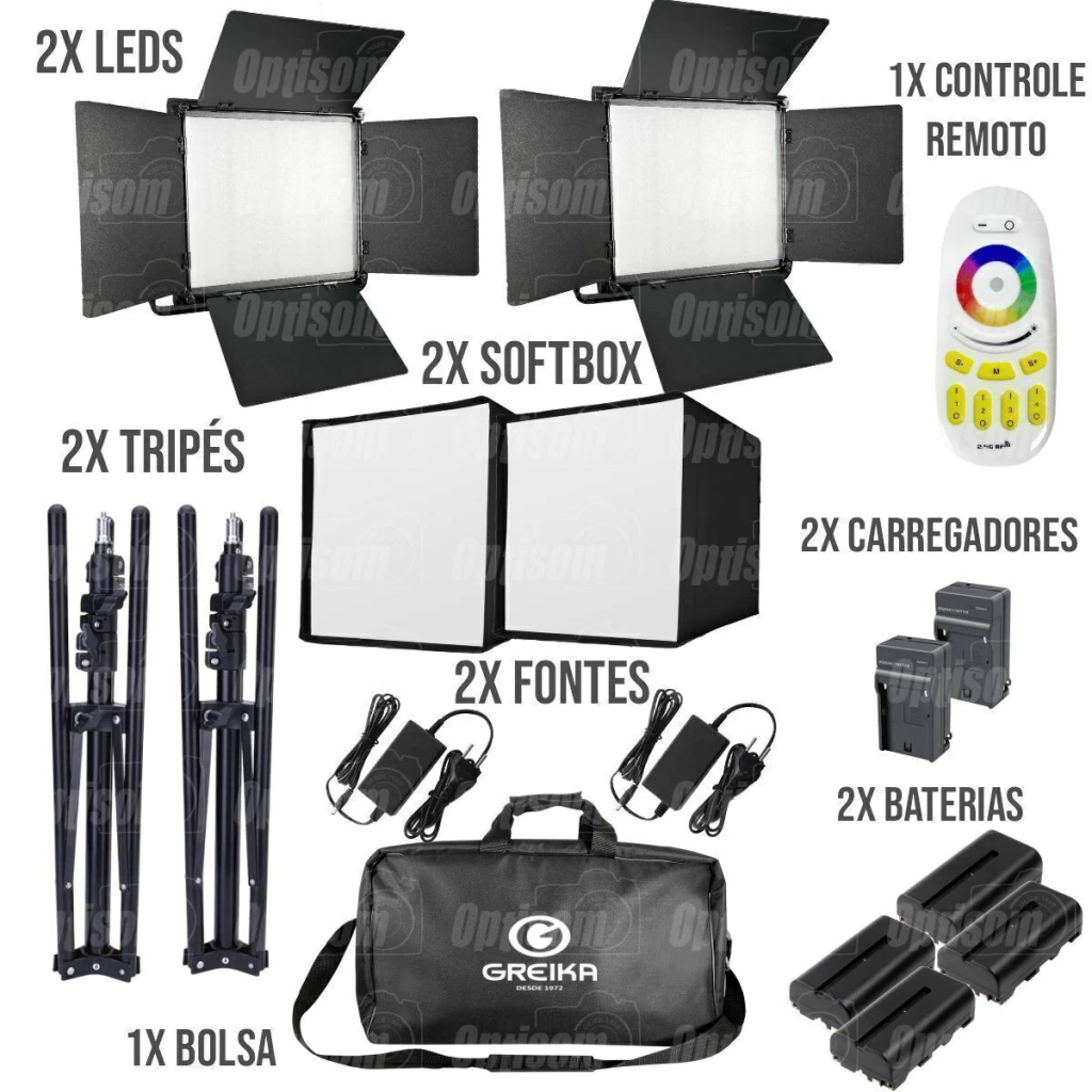 Kit COMPLETO 2 Painel Led Greika 60W RGB CCT 8 EFEITOS DE LUZ COM BATERIAS SOFTBOX TRIPÉ
