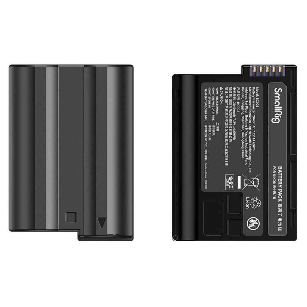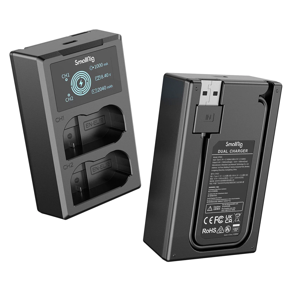 O Kit de 2 Baterias EN-EL15 com Carregador Duplo da SmallRig é uma solução portátil com um cabo USB-A integrado no carregador, permitindo a conexão direta a adaptadores de energia USB padrão. O carregador também possui uma porta de entrada USB-C, que permite conectar carregadores portáteis e outras opções de energia usando um cabo USB-C opcional. As duas baterias de íons de lítio do tipo EN-EL15 têm capacidade de 2040 mAh cada. O carregador duplo fornece carregamento simultâneo e exibe o status da carga, a voltagem e a corrente em sua tela LCD. ESPECIFICAÇÕES TÉCNICAS: Quantidade de baterias: 2 Quantidade de slots do carregador: 2 Saída: 8,4V, 1.000mAh Entrada: USB-A/USB-C 5V, 2,1A Material: ABS E PC ITENS INCLUSOS: Kit de bateria e carregador para câmera SmallRig EN-EL15 02 baterias tipo EN-EL15 01Carregador de bateria duplo 02 capas protetoras de bateria Garantia Limitada de 06 meses
