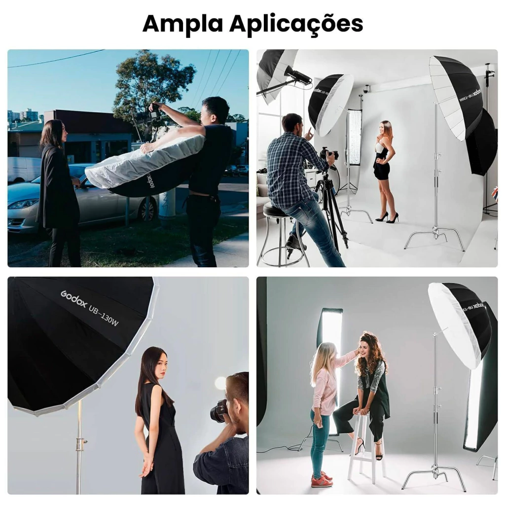 A sombrinha difusora 130cm proporciona uma luz ampla e super suave, ideal para retratos, fotografia de produto, moda, gastronomia e vídeos profissionais, eliminando sombras duras e criando um aspecto natural.