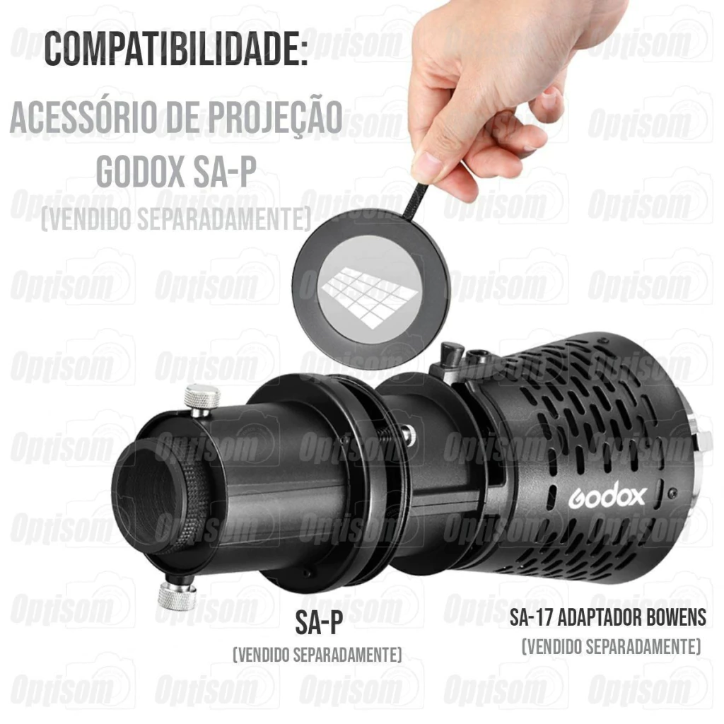 Ele só é compatível com o iluminador fresnel Godox S30/S60 + Lente 85mm ampliadora SA-P para S30/S60 (vendidos separadamente).