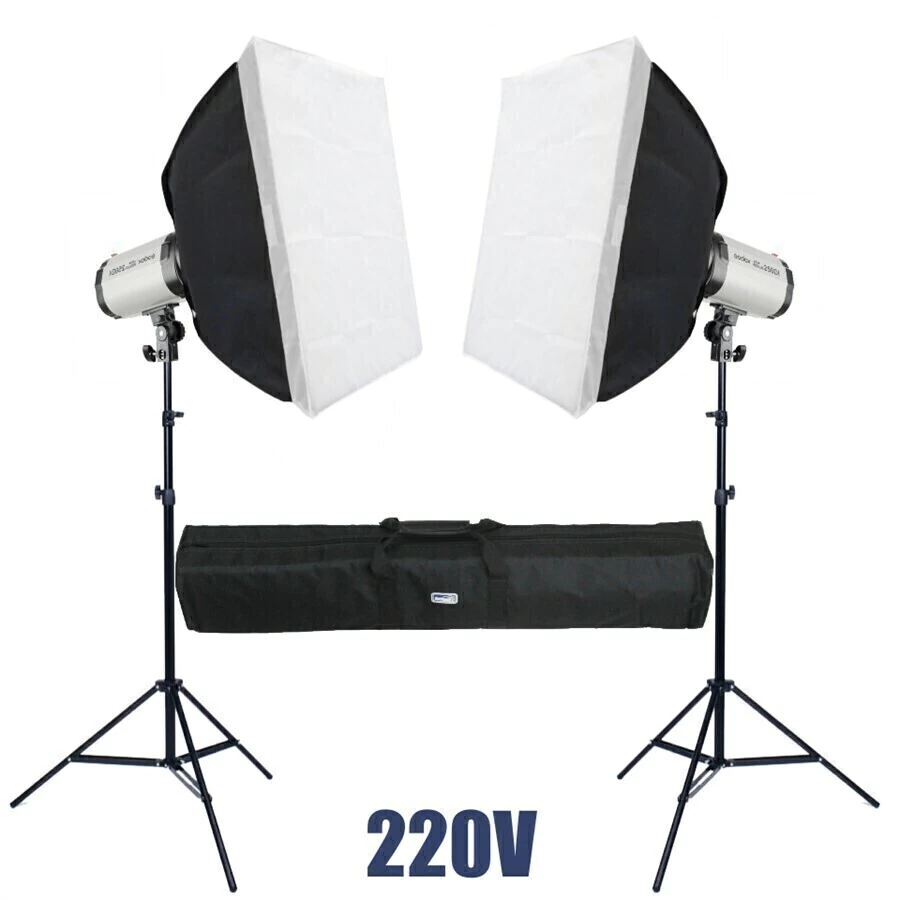 Kit Flash Estúdio Duplo composto por duas tochas Godox 250DI 250W 220V + Dois Tripés de iluminação de 2 metros + Dois Softboxes 60X60CM + Uma Bolsa para transporte !