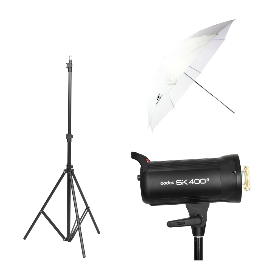 Incluso tripé de iluminação 2,6 metros, sombrinha Greika S40 e Tocha Godox SK300 II.