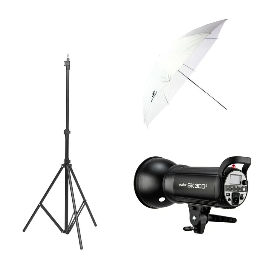 Incluso tripé de iluminação 2,6 metros, sombrinha Greika S40 e Tocha Godox SK300 II.