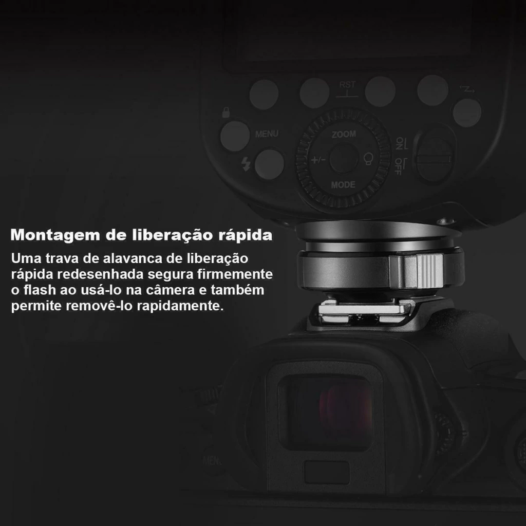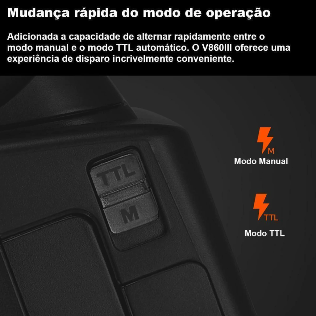 Atualização da linha V860, essa versão conta com uma luz de modelagem led de 2W para você ter um “preview” de como a luz do flash vai incidir na cena.