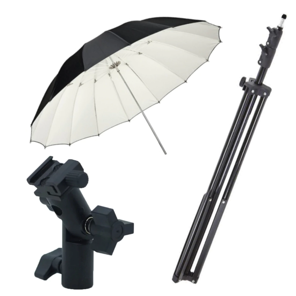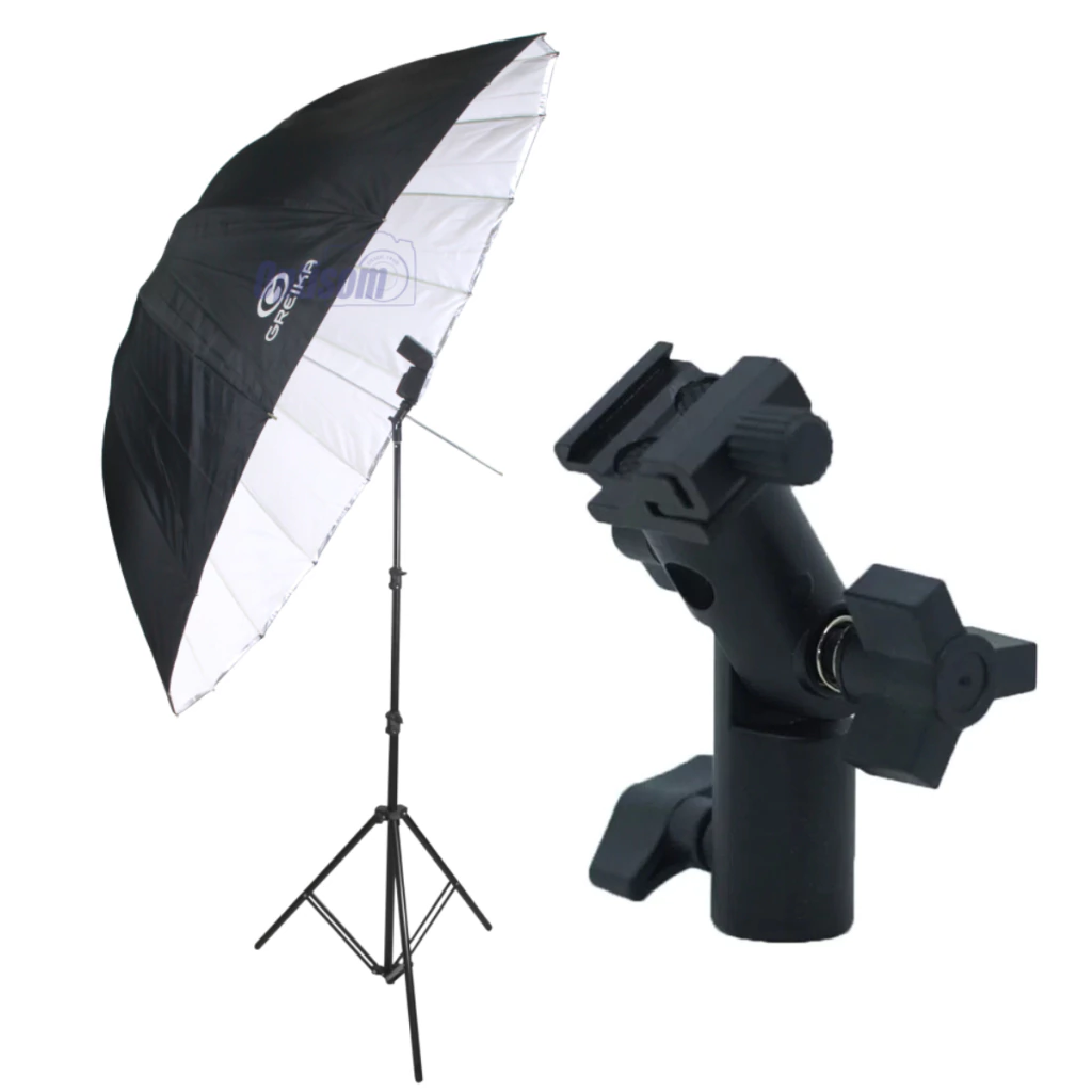 Kit sombrinha rebatedora Preto/Branco greika 180 cm com suporte para flash sapata speedlite e tripé! Compatível com todos os flashes tipo sapata disponíveis no mercado!
