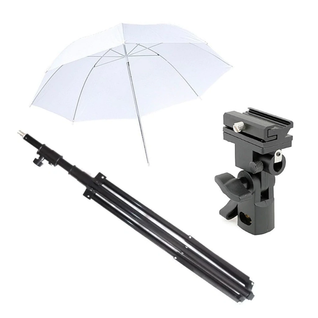 Kit Greika com suporte articulado para flash dedicado universal, tripé Greika com altura máxima de 2 metros e sombrinha Difusora Branca de 90 cm de diâmetro.