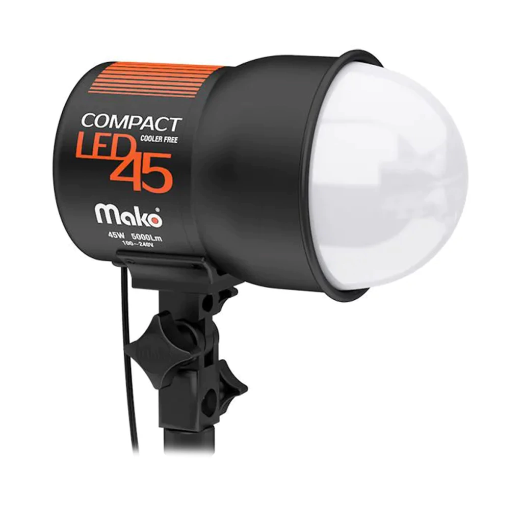 Ponto de luz composto por iluminador Led Compact 45W + Tripé Girafa Wide V-Lite Mako + Barndoors 135 Mako + Bolsa Optisom de 1,30 m.